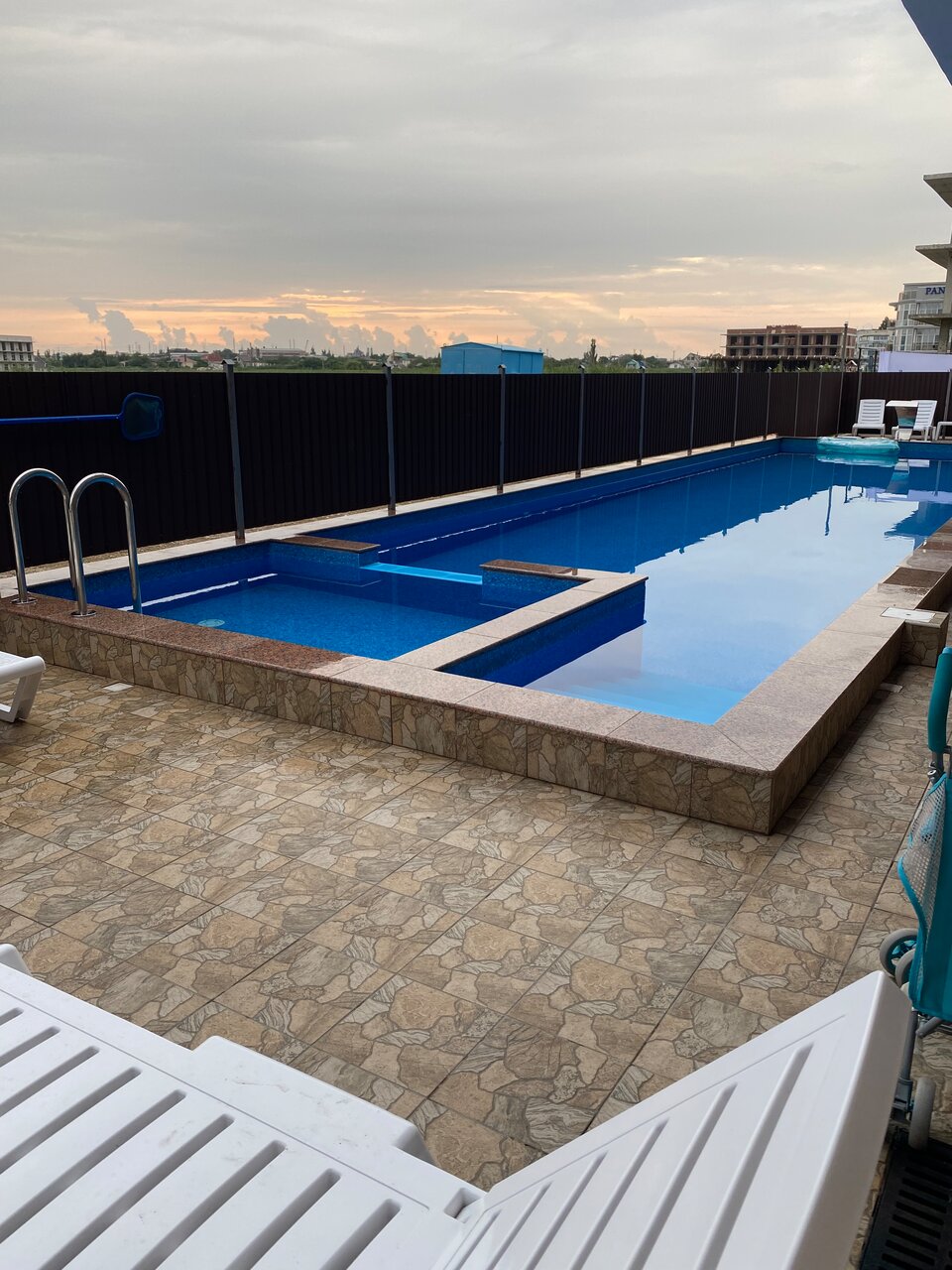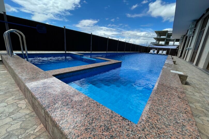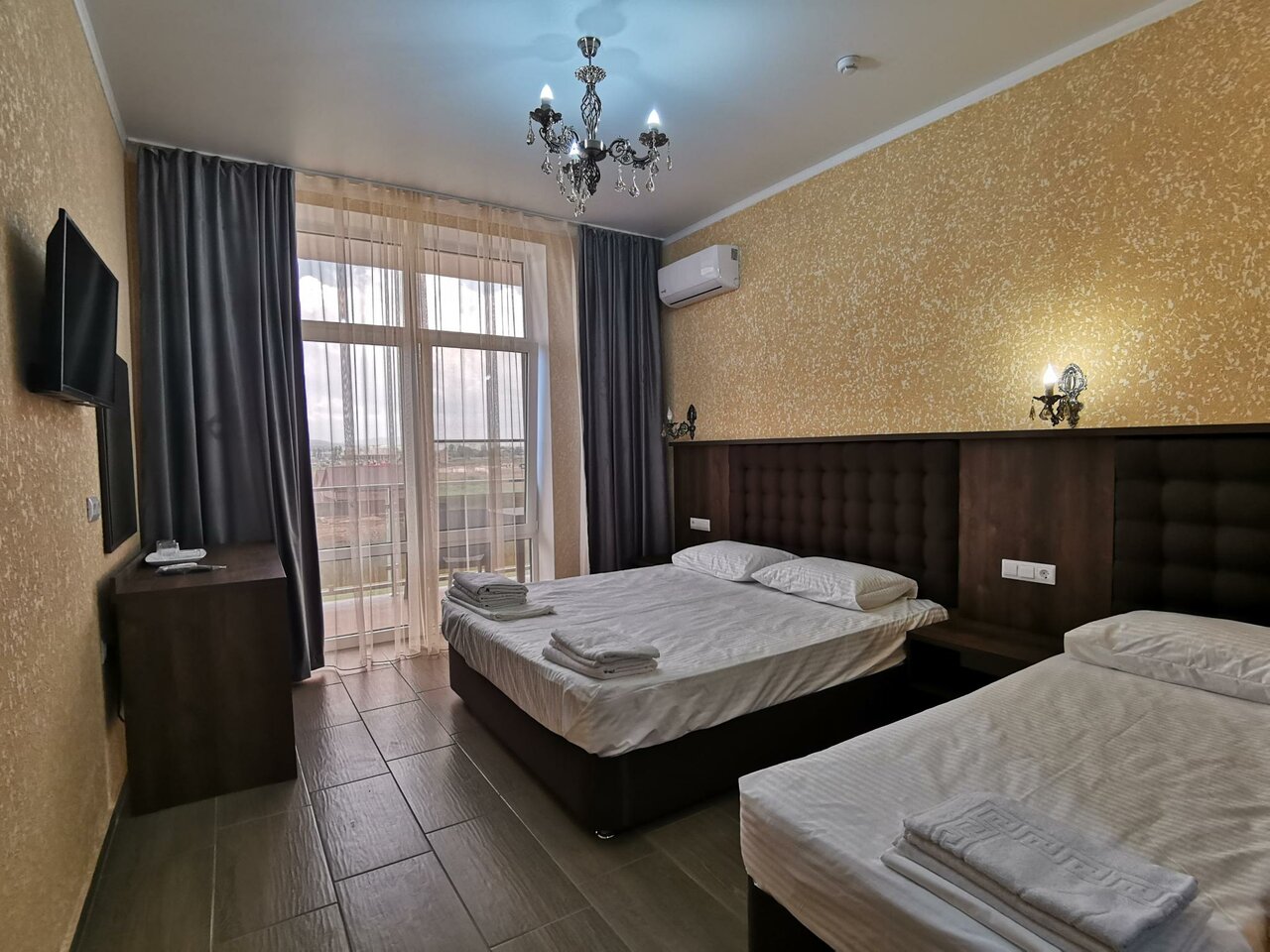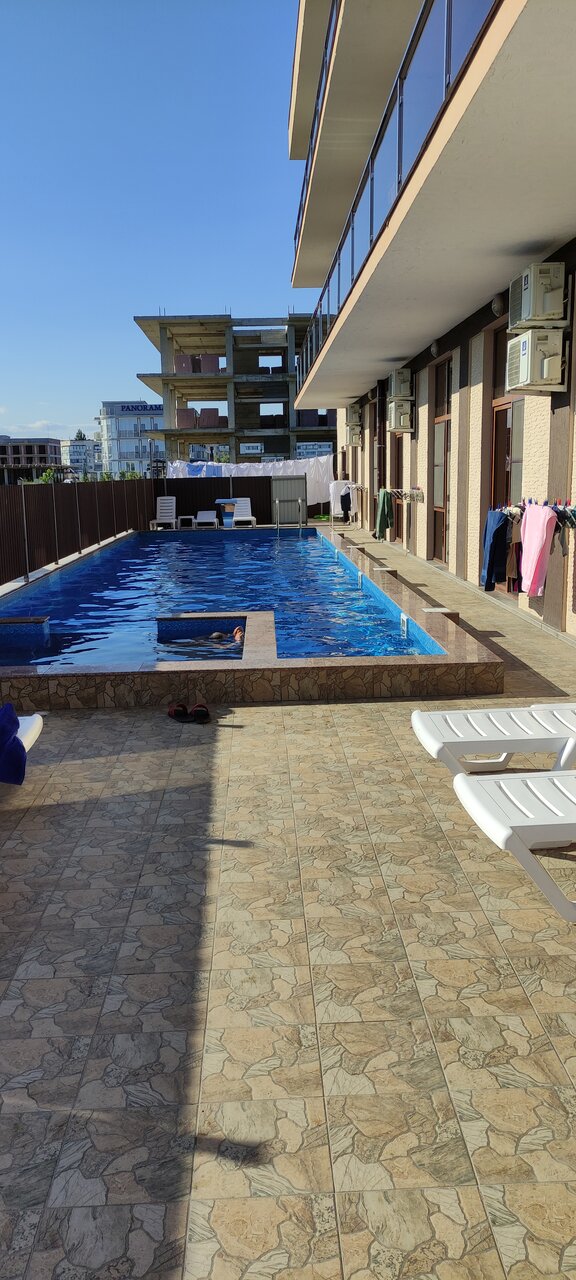 Отель новый, чистый. Уборка по вашей просьбе при вывешивании таблички. Были на третьем этаже в трехместном номере. Мебель новая, постельное и полотенца тоже. У нас был балкон с видом на море. Вид не очень, так как непосредственно лазурного моря нет, сначала видишь дорогу и только потом море. Есть свой бассейн, довольно приличный и глубокий с моим постом 167, мне по подбородок, есть для деток отдельный закуток, лягушатник.Вкуснаяя столовая на первом этаже, порции просто огромные. Единственное немного дороговато. Завтрак в среднем 500 р, обед 900-1000, ужин в районе 800 на двоих. Ну это конечно смотря кто, что берет, однако мы брали первое, второе и компот. Но еда, реально вкусная, сытная. А самыйиглпвный плюс, что чтобы попасть на море, нужно перейти дорогу и прямо напротив этого отеля светофор с пешеходным переходом. Другим отелям мало повезло с этим и по жаре не очень то хочется идти до перехода. Перебежать дорогу не удастся, так как трасса оживленная очень.