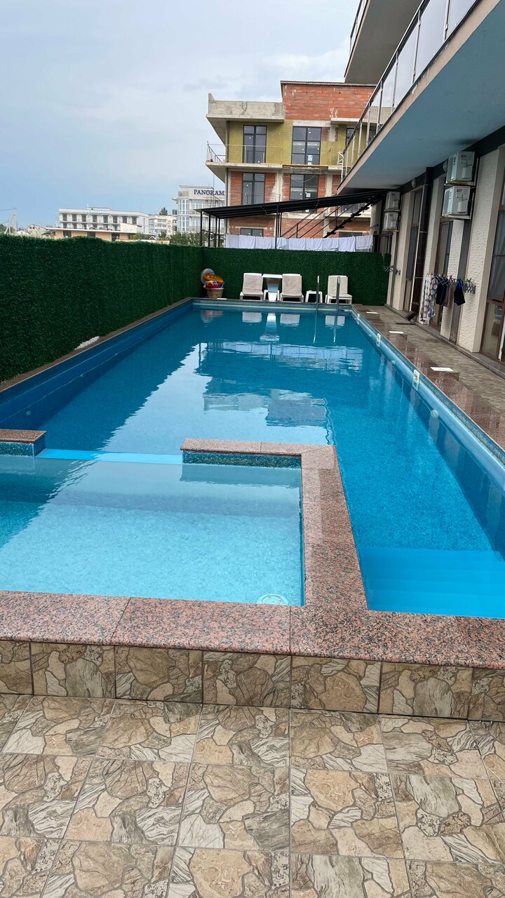 Номера удобные, персонал приветливый, еда вкусная . От моря два шага. Есть отличный бассейн с подогревом воды. Мне очень понравилось .