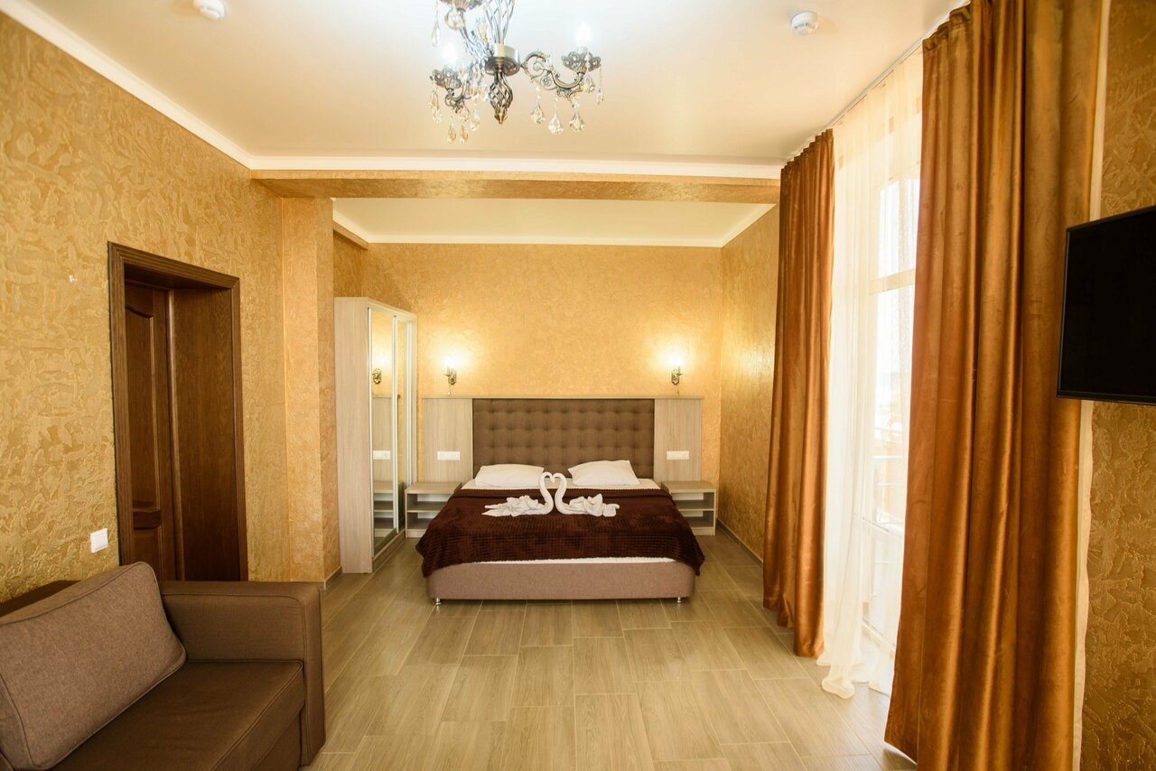Просторный, уютный 2-х комнатный 'Семейный' люкс с видом на море.50кв.м., 6 мест+1 доп.место. Оборудован: две 2-спальных кровати, диван, прикроватные тумбочки, шкаф-купе, вешалка, зеркало, стол, стулья. Кондиционер, телевизор, холодильник.