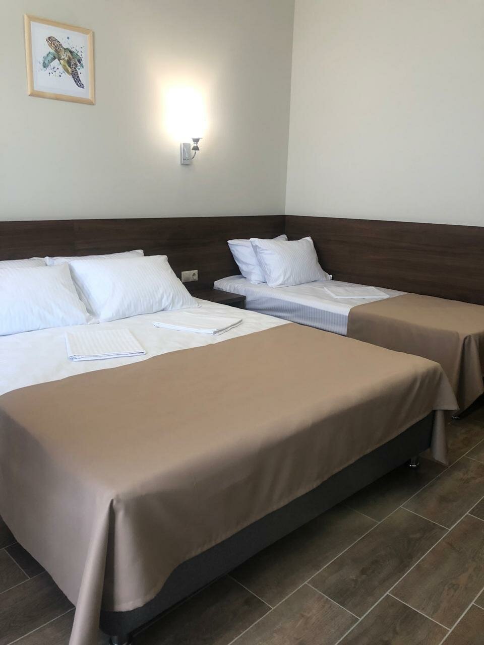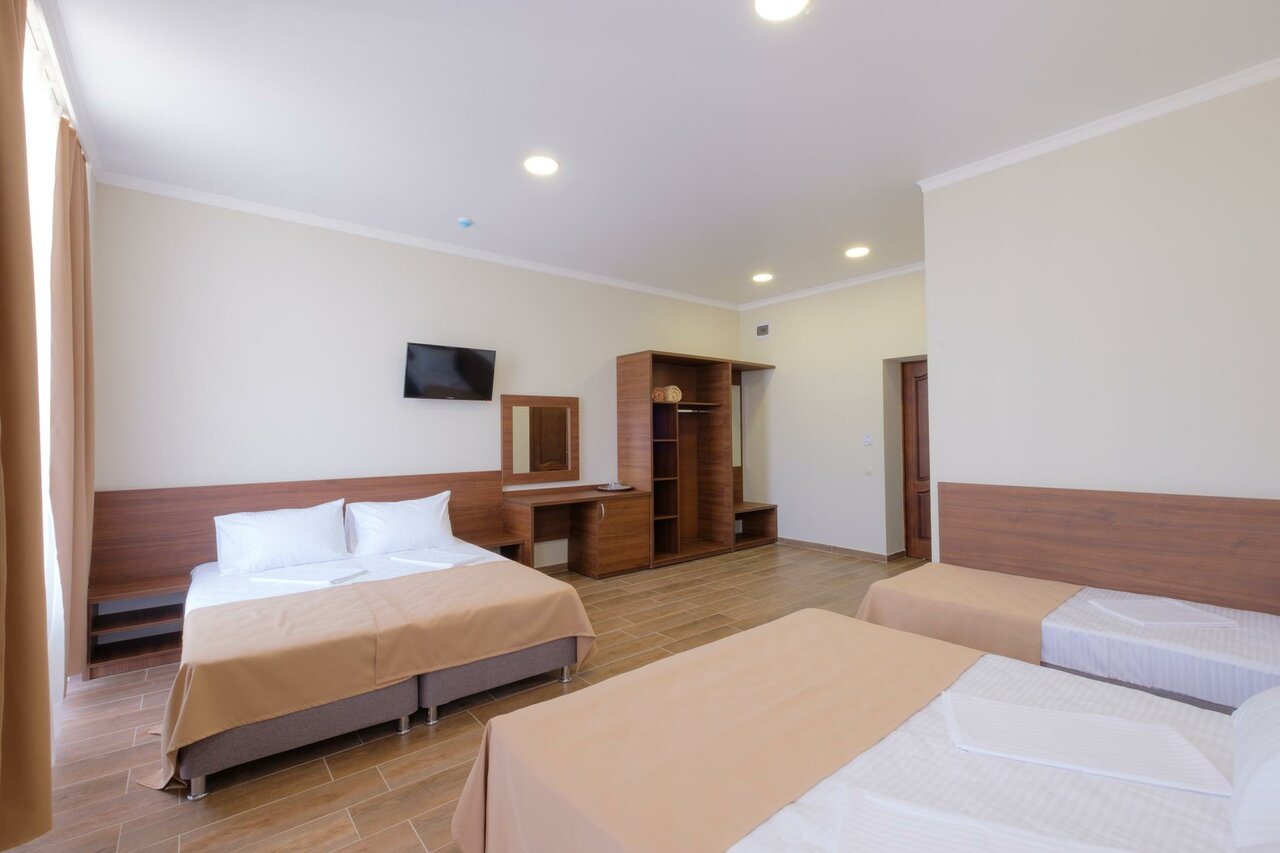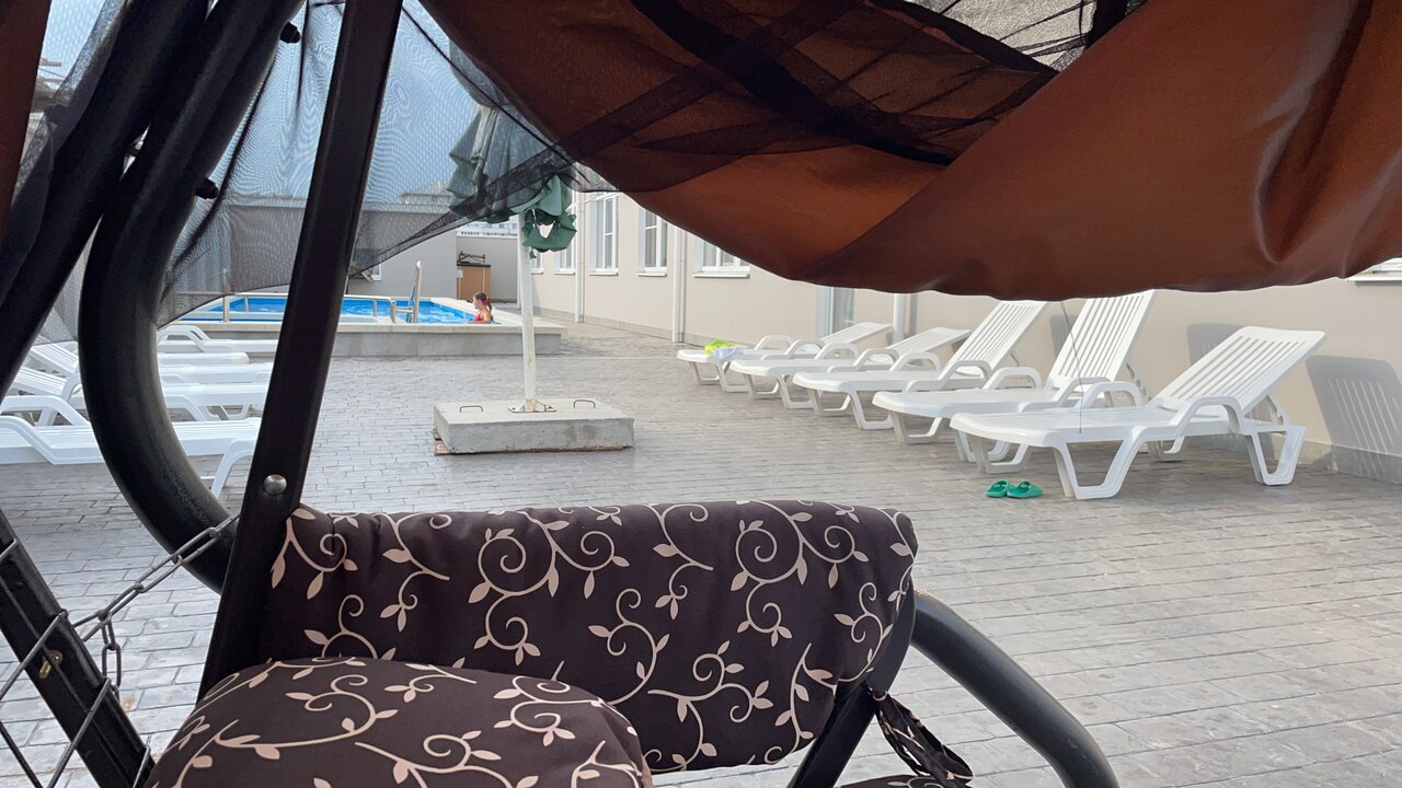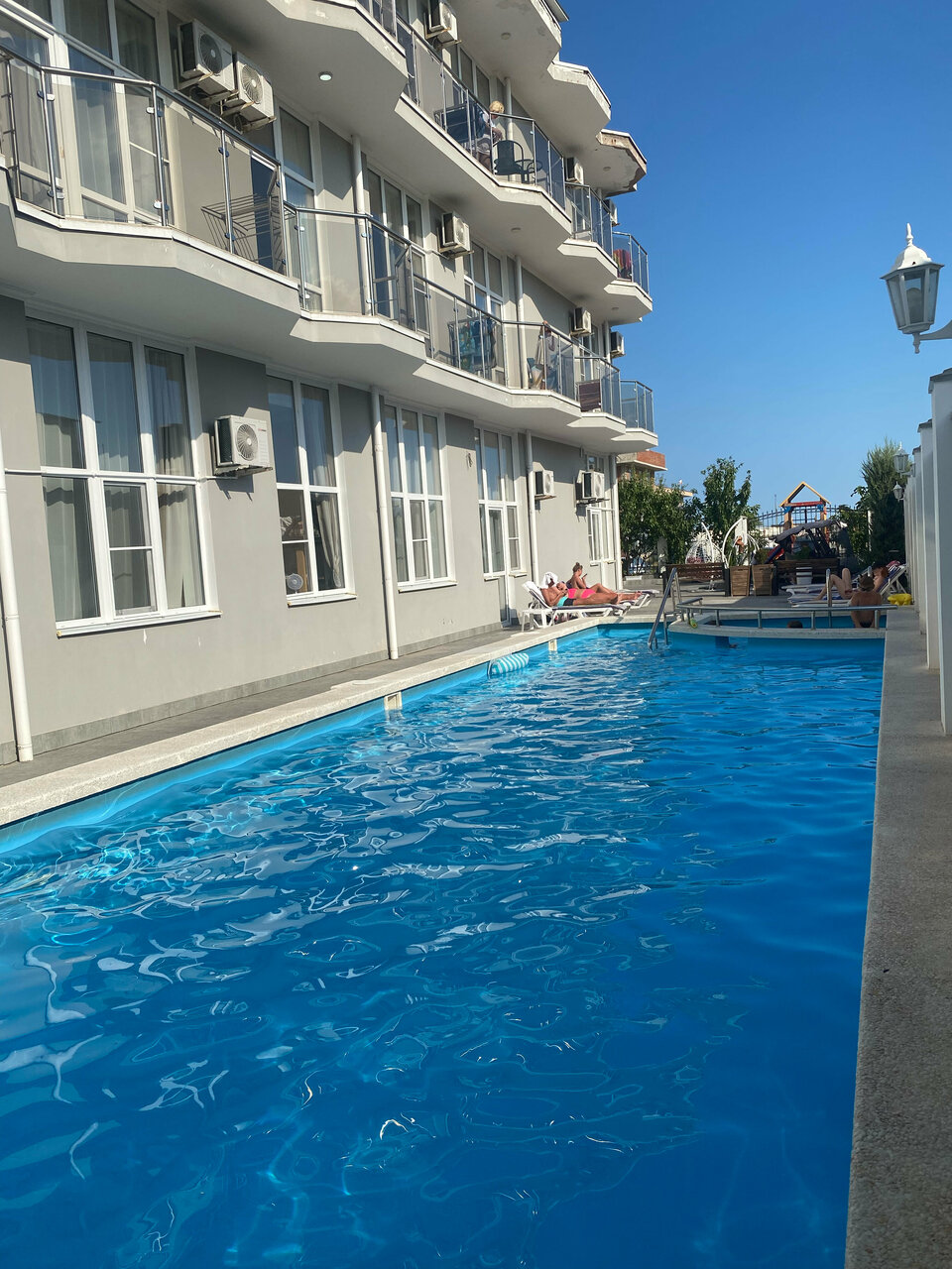 Место хорошее, гостиница новая. Везде чисто, все аккуратно. На территории бассейн, небольшая детская горка и шезлонги. Свое кафе-столовая, еда без каких-либо изысков, но все вполне сносно, минус очень соленая. Расположение гостиницы для пляжного отдыха идеально, пляж в 2-хминутах ходьбы от моря. Из минусов. Кроме пляжа больше ходить некуда, магазины далеко, кафе-ресторанов нет, только столовая гостиницы и такие же столовые в гостиницах рядом. В номере нет чайника и нет воды в общем доступе. Кафе-столовая только до 21 (+- пока хозяйка на месте).