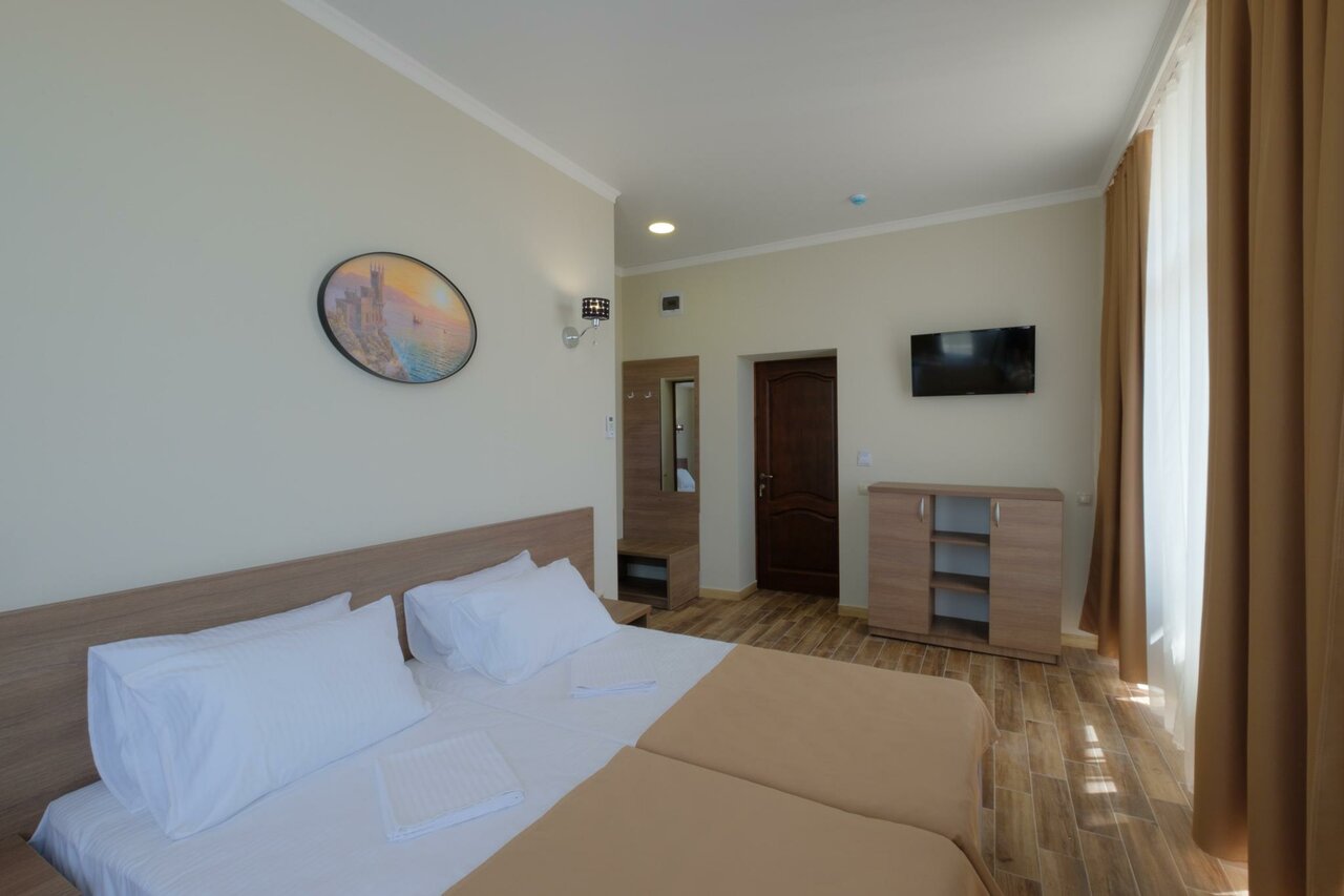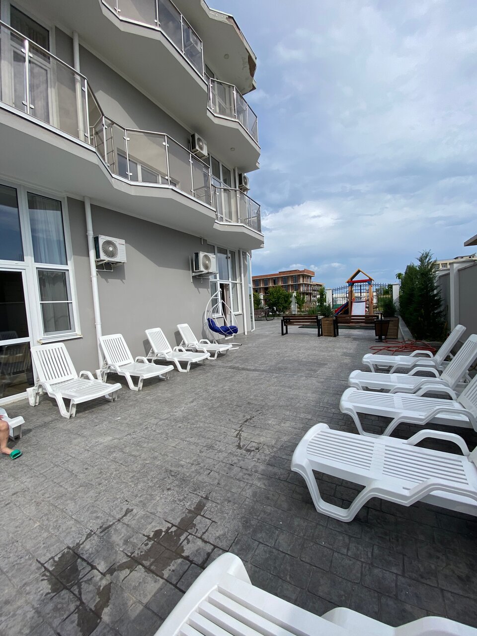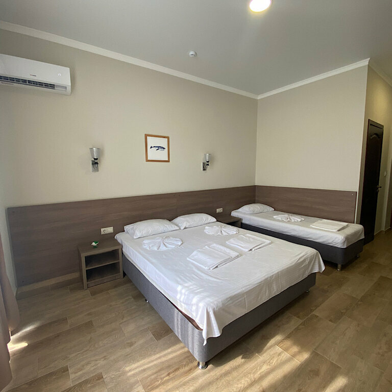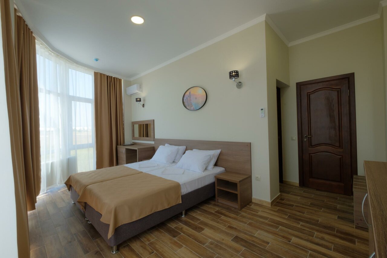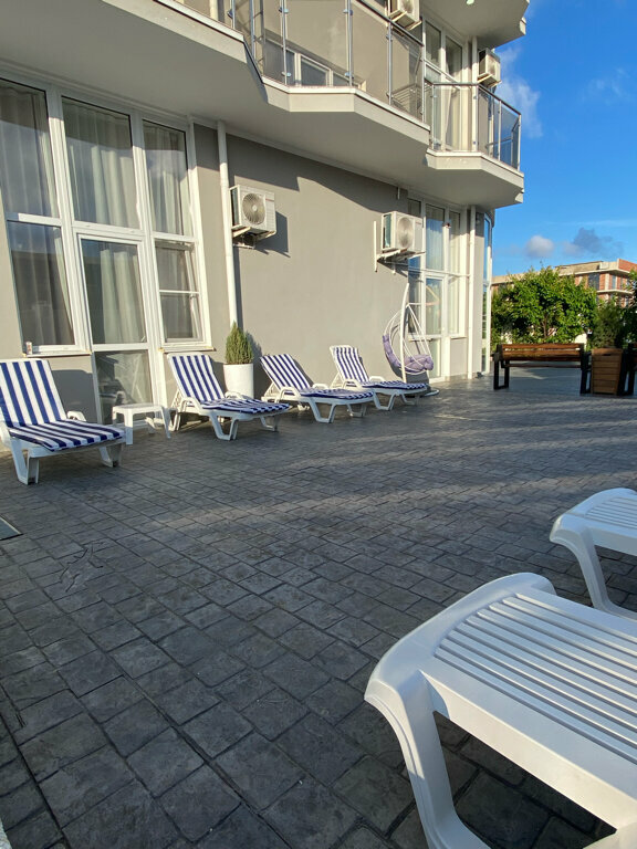 Место хорошее, гостиница новая. Везде чисто, все аккуратно. На территории бассейн, небольшая детская горка и шезлонги. Свое кафе-столовая, еда без каких-либо изысков, но все вполне сносно, минус очень соленая. Расположение гостиницы для пляжного отдыха идеально, пляж в 2-хминутах ходьбы от моря. Из минусов. Кроме пляжа больше ходить некуда, магазины далеко, кафе-ресторанов нет, только столовая гостиницы и такие же столовые в гостиницах рядом. В номере нет чайника и нет воды в общем доступе. Кафе-столовая только до 21 (+- пока хозяйка на месте).