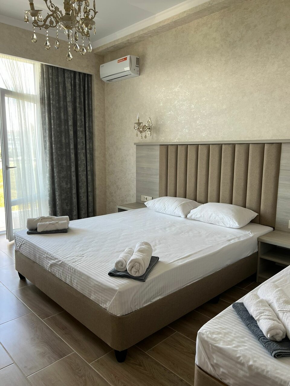 Очень хороший отель. Свежайший ремонт. Все такое аккуратное и красивое. Постельное белье просто на высочайшем уровне. За жто отдельное спасибо владельцу!!! Кровать и мебель красивые, матрас удобный. Номер на троих просторный, есть шкаф, тумбочки, туалетный столик. На балконе стол и стулья, есть куда повесить белье. Номера открываются от карточки ключа. Отдельное спасибо за фумигатор. Приняли очень хорошо, вежливый персонал. До моря 5 минут медленым шагом. Даже пожалели, что проездом всего на 1 день, захотелось остаться.