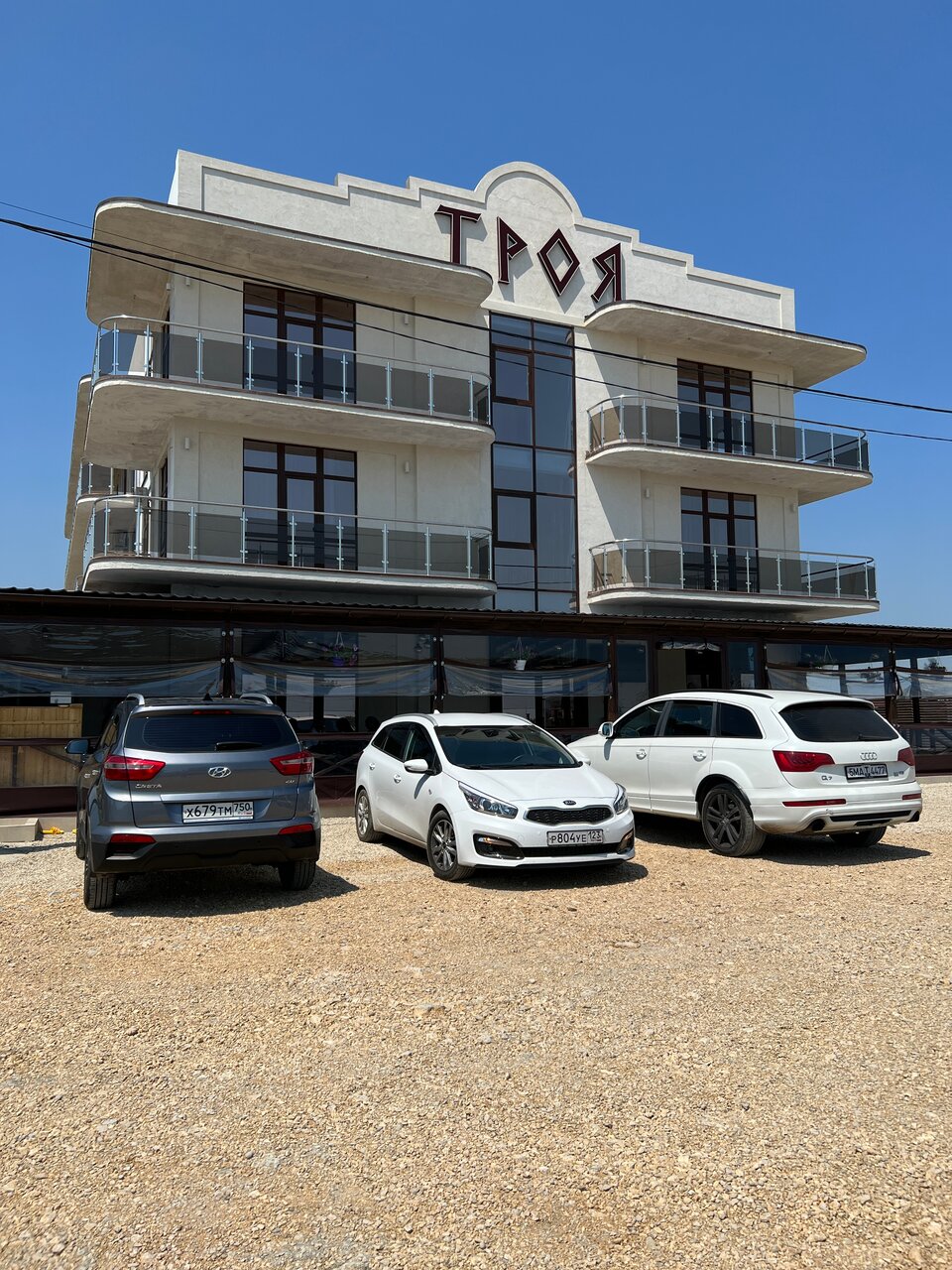 Услуги: ускоренное заселение, круглосуточная стойка регистрации, уборка, фен, терраса. Контакты: +7 (978) 572-81-24, +7 (989) 996-56-08. Сайт: https://troya-hotel.ru/.