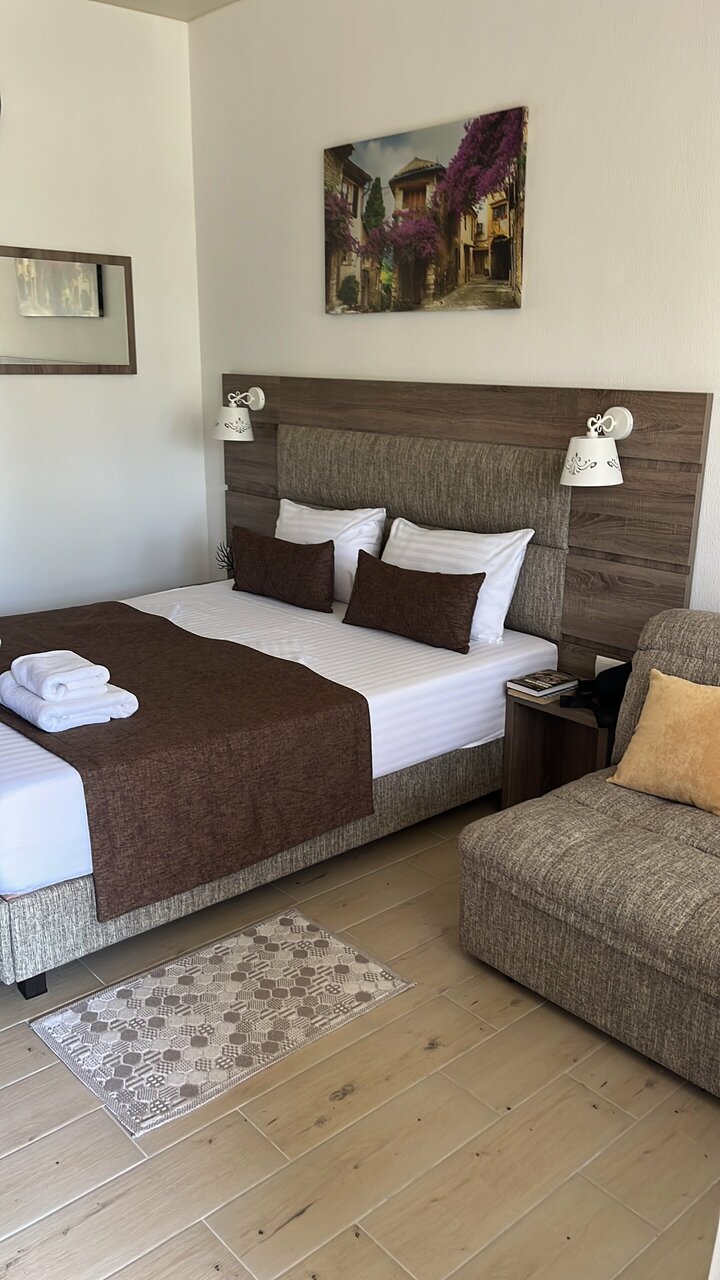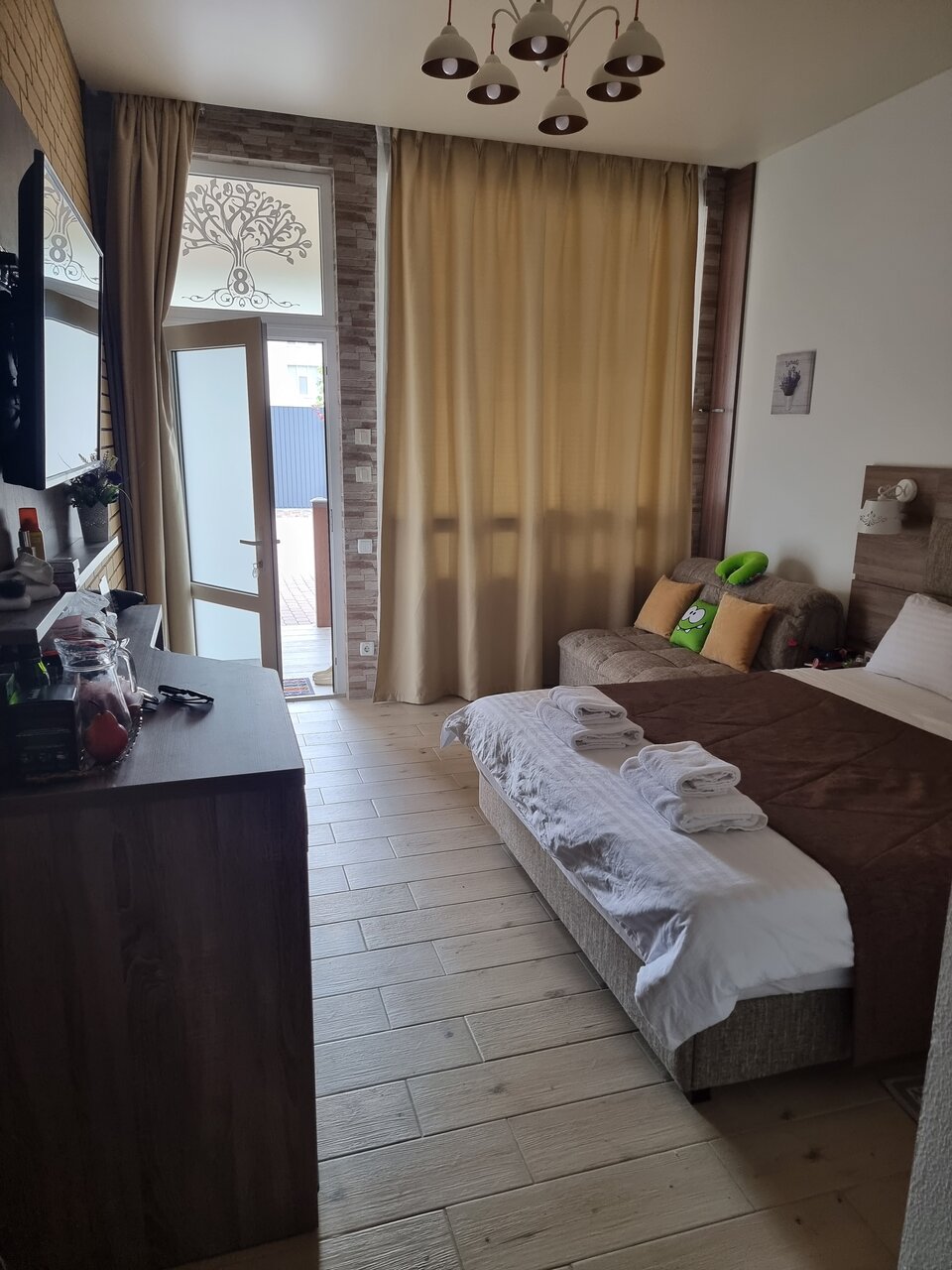 Мне очень понравился эта небольшая, всего 11 номеров, гостиница. Очень тихо и комфортно, нет шума машин и гула от отдыхающих. Вода в номере с напором, кондиционер стоит удобно не дует на кровать. Очень внимательный и обходительный управляющий Игорь Иванович. Машину ставишь на закрытой территории, напротив своего номера, поэтому нет необходимости выгружать все вещи из машины. Находится реально в 10 минутах от моря . Берег песок. Рядом целая торговая улица можно поужинать, купить выпечку, есть супермаркет. Остался очень доволен от данной гостиницы.
