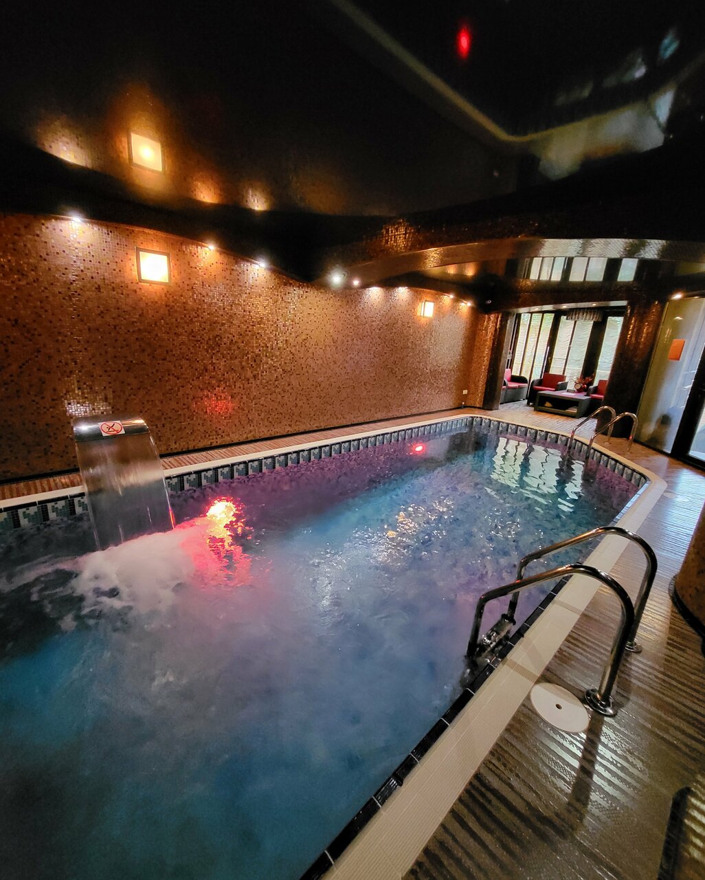 - Шикарный закрытый бассейн с подогревом, водопадом, подводным массажем и искусственным течением.