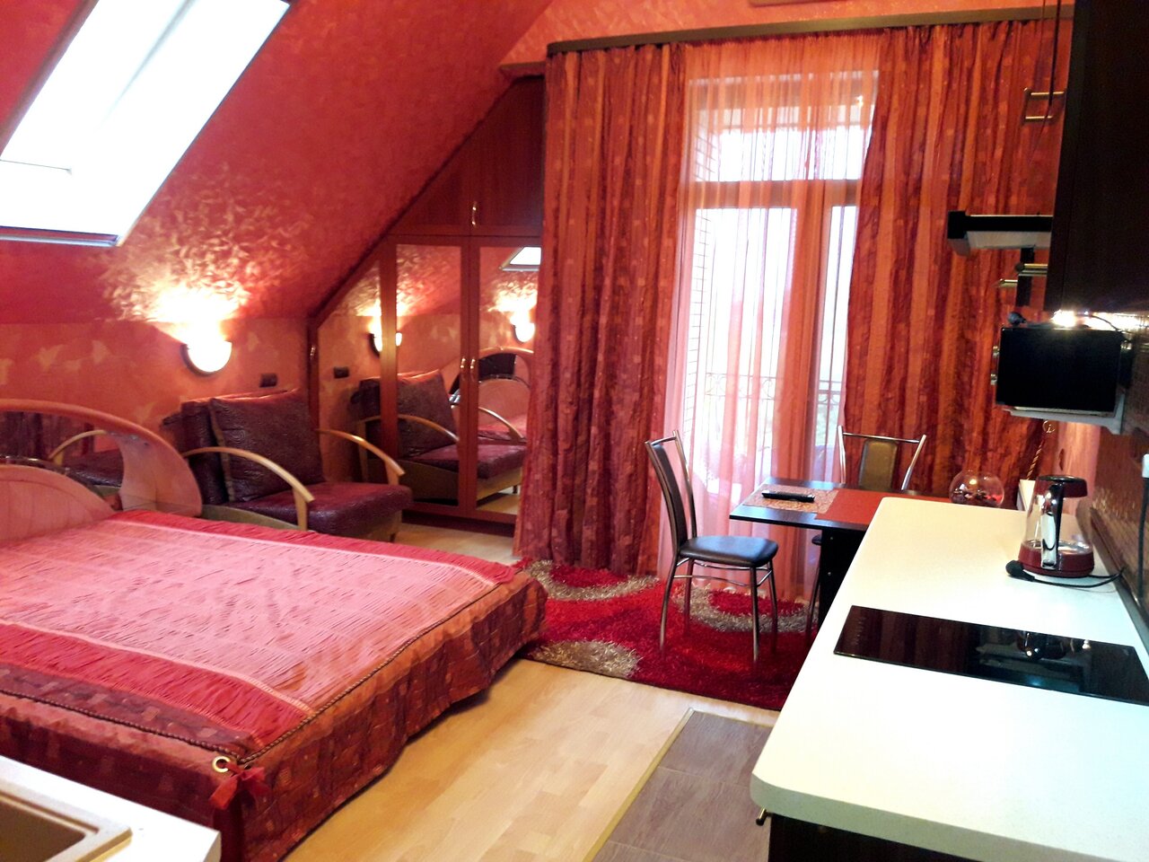 Удобства: — Терраса, прачечная, уборка, сейф. — В номерах: телевизор, фен, холодильник, микроволновка, плита, посуда.
