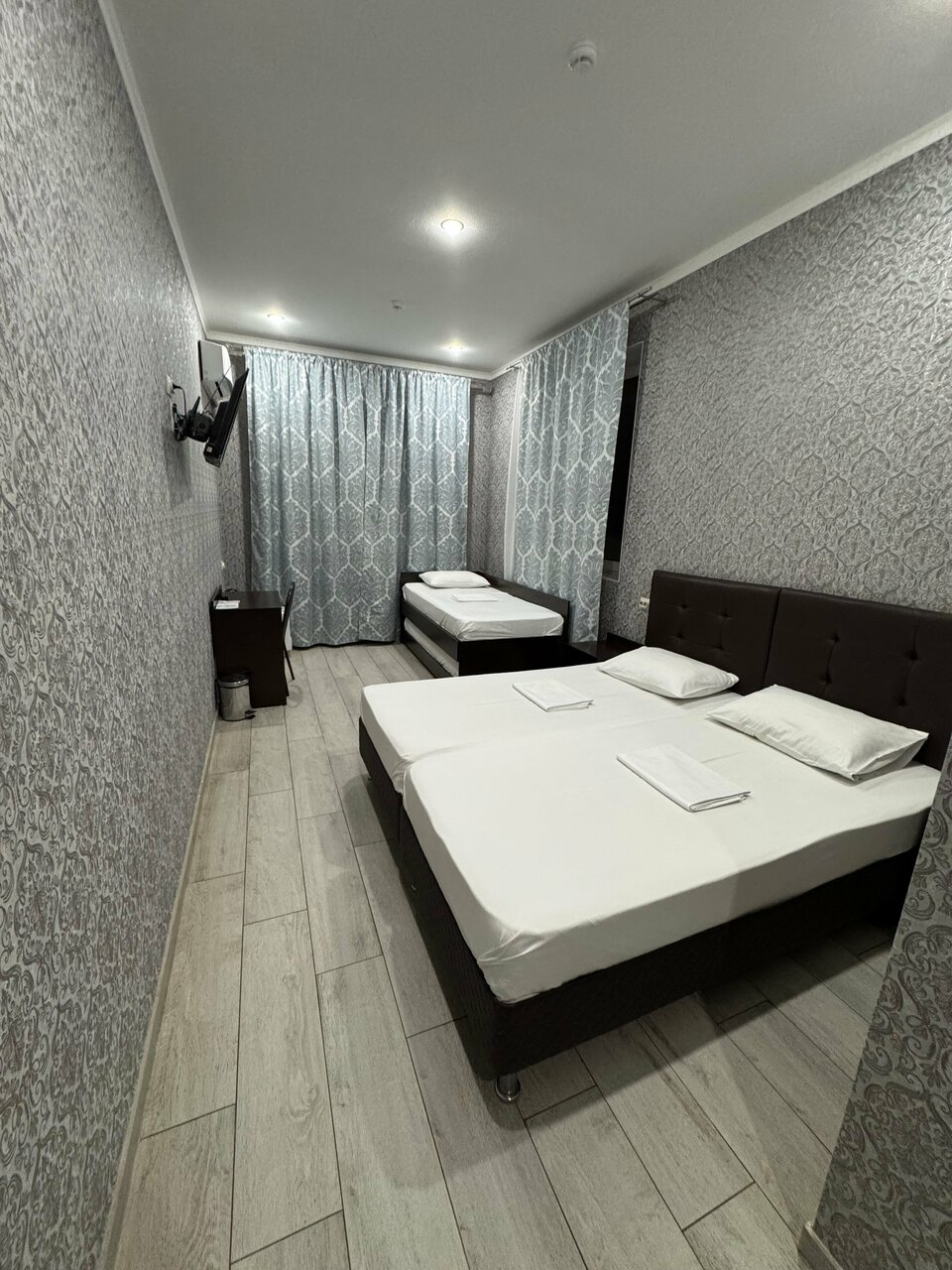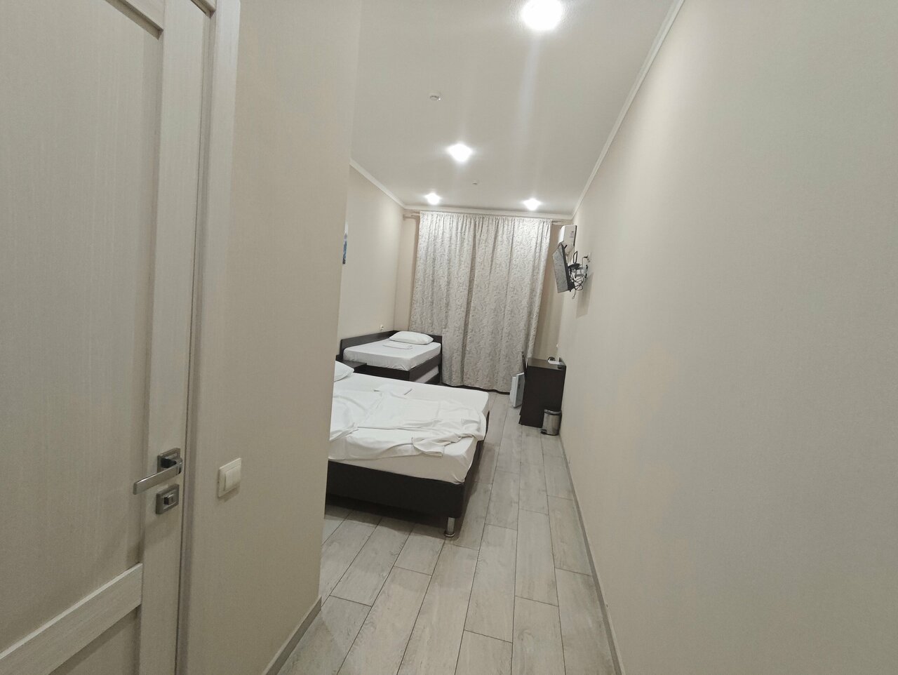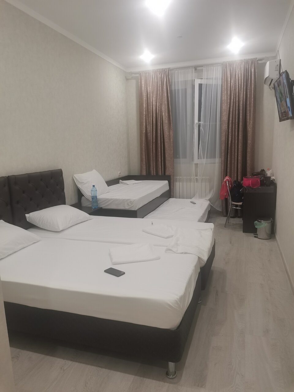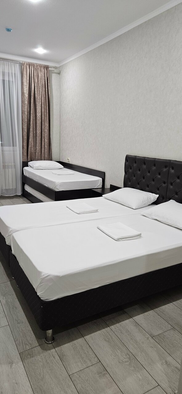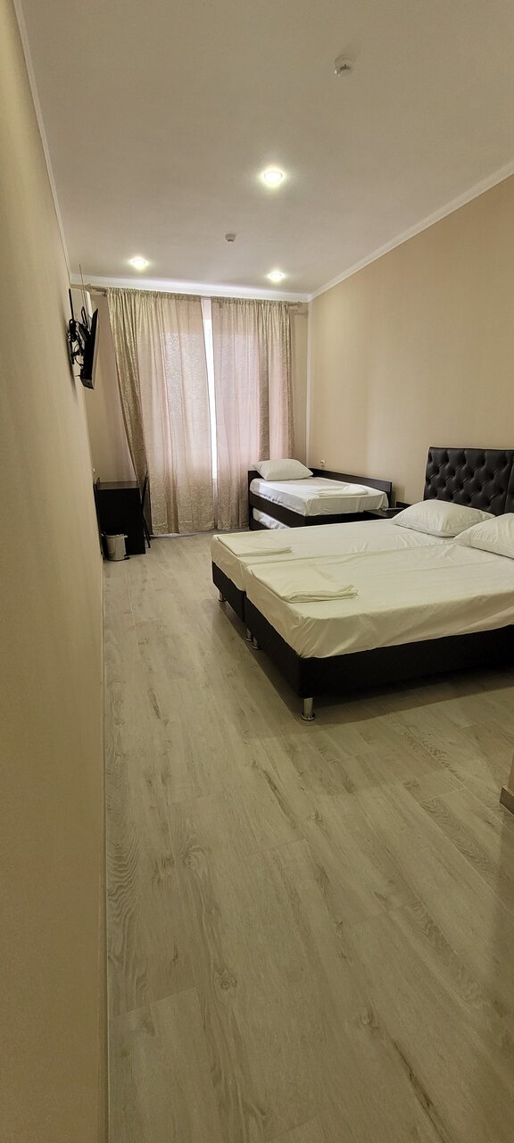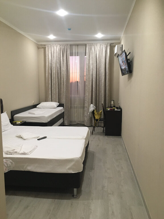 Отель расположен вдоль трассы М4. Удобно , когда возвращаешься с морей. Бронировали комфортный 4х местный номер. Отель новый. Отличный ремонт, чисто, аккуратно. Есть тапочки, полотенца, гигиенические принадлежности. На этаже кулер с водой, пакетики чая, кофе. Находится в одном здании с магазином Пятёрочка. Небольшие минусы- нет прикроватный ламп, освещение только на потолке и отсутствие звукоизоляции между номерами.