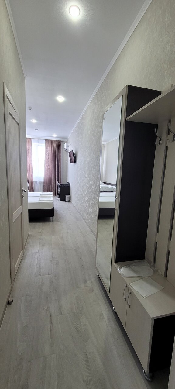 Остановились на одну ночь по дороге на море. Очень довольны выбором. Свежий, симпатичный ремонт. Приветливый персонал. Номера, хоть и небольшие, но в четвером (2 взрослых+2 ребёнка) было комфортно. Удобные кровати с хорошими матрасами, в номере всё работает (кондиционер, чайник, холодильник, ТВ). Ванна достаточно просторная (и сама комната и непосредственно душевая). Из минусов: вода имеет неприятный минеральный привкус, но в общем коридоре стоит кулер, там же микроволновка, чай-кофе-сахар. Соседняя дверь от отеля — Пятерочка (работает до 23.00), вокруг есть несколько круглосуточных кафешек (их качество, правда, вызывает сомнения, но мы ужинали в той, что называется ‘Столовая’, вкусно, с желудками всё ок 🙂