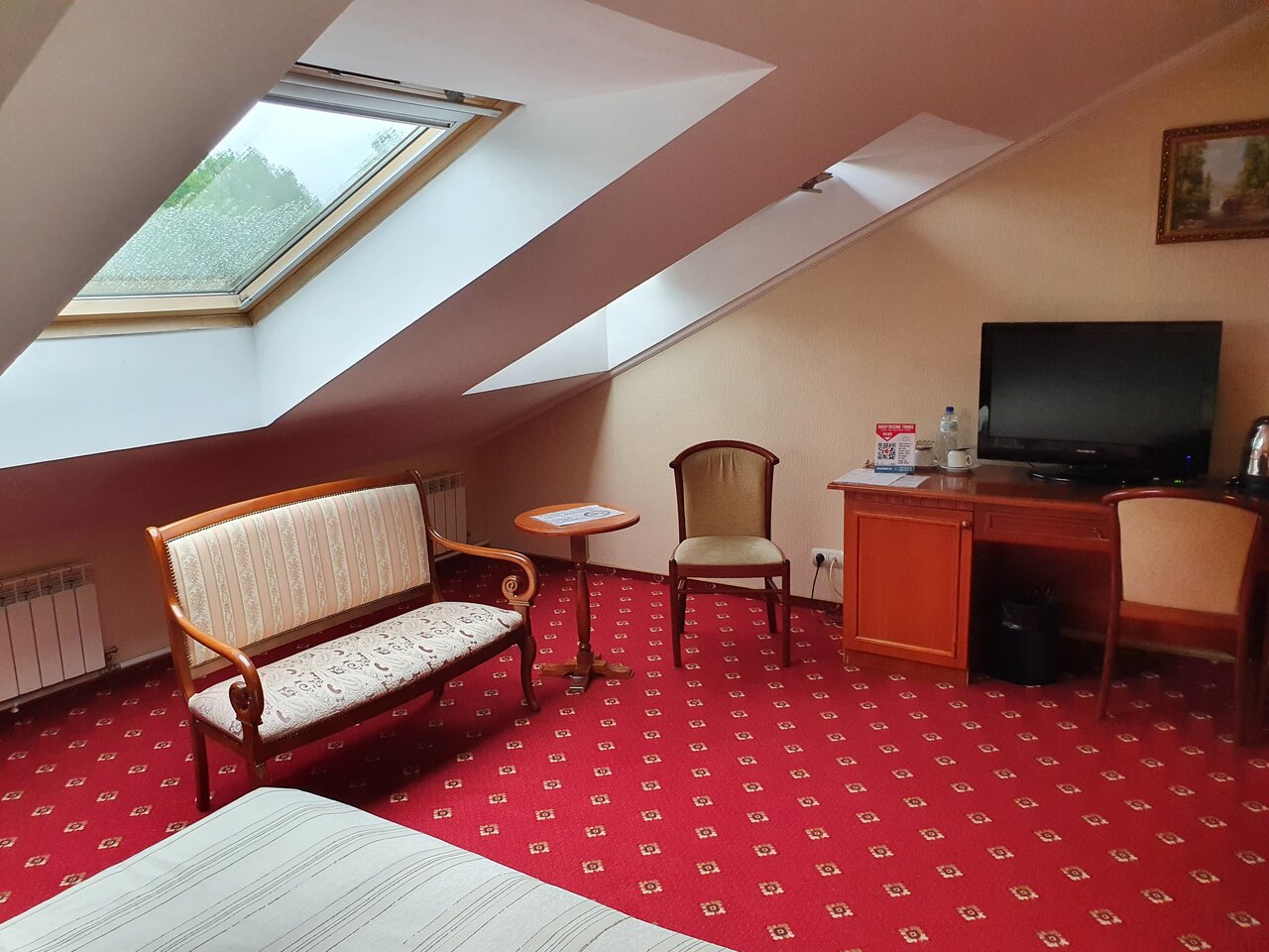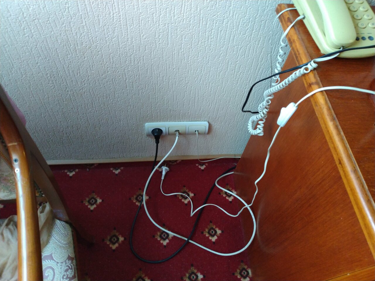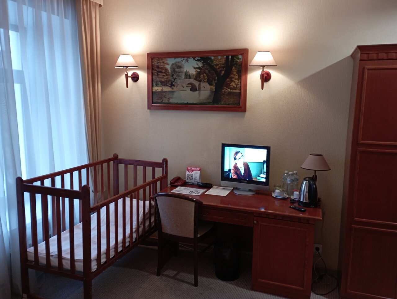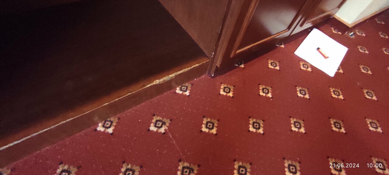 Не работает телевизор ( минуту поработает, потом пишет, что плохой сигнал). Гостиница старая, номера уже не такие, как на фото… Пятна на полу, на стенах, всё уже пошарпанное, пыль, единственный плюс — это очень хорошее местоположение отеля и наличие парковки
