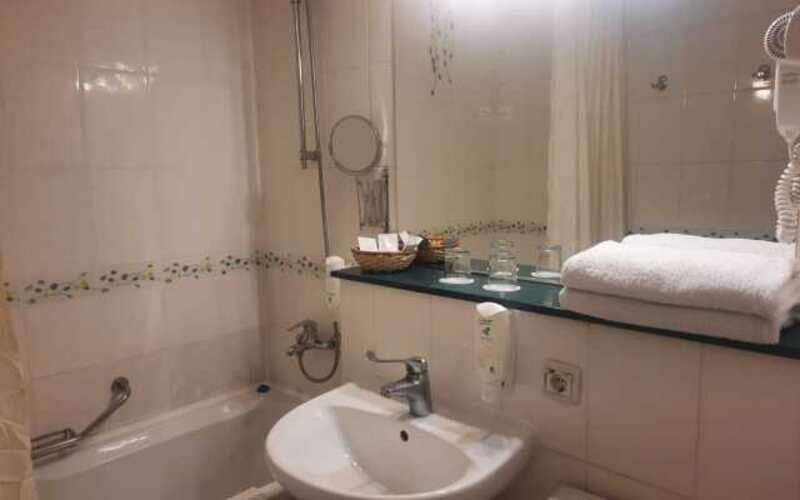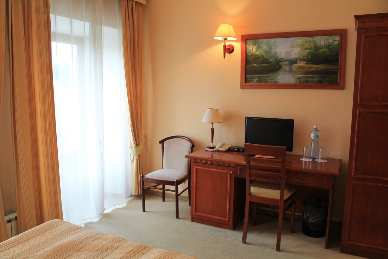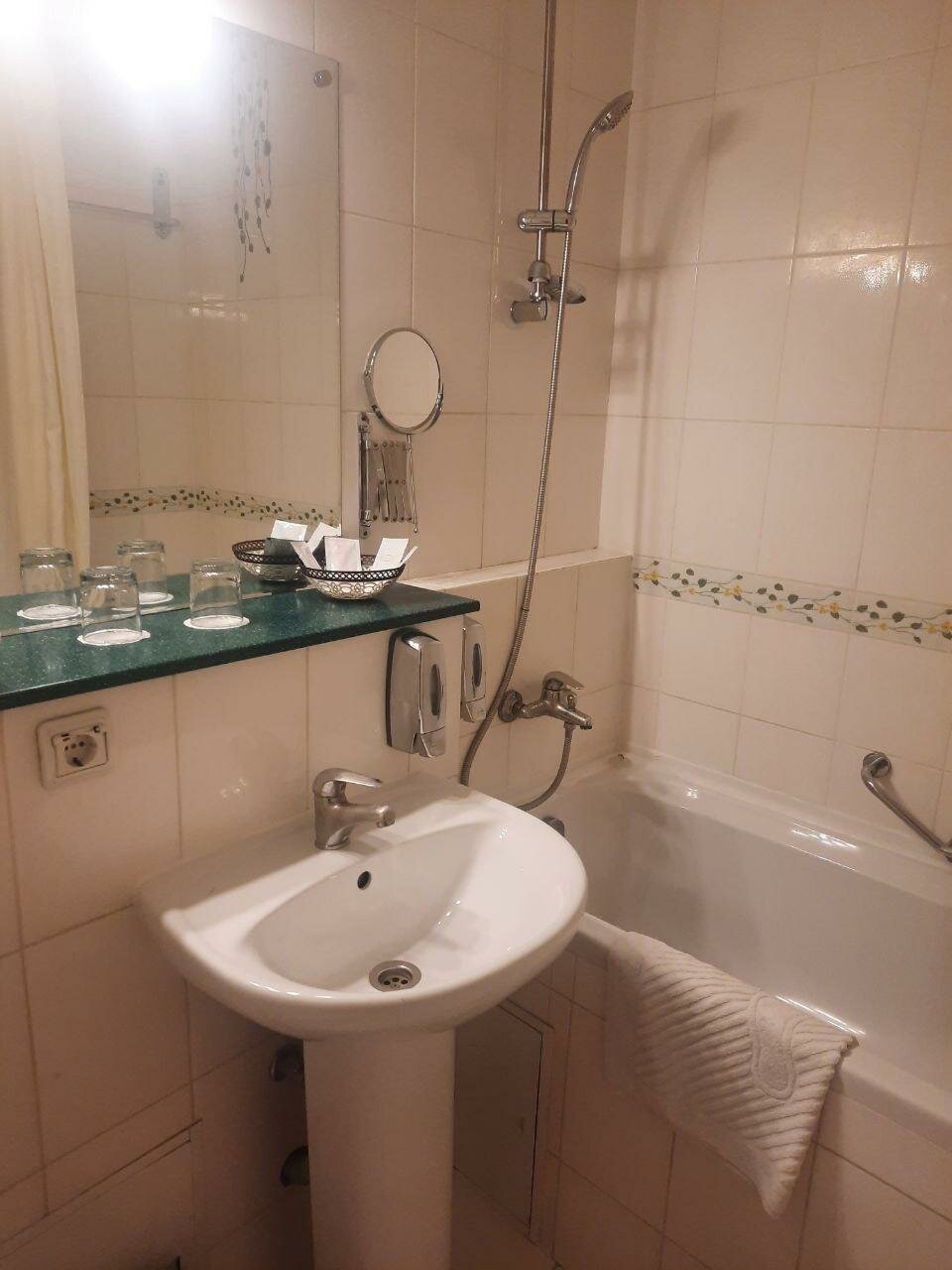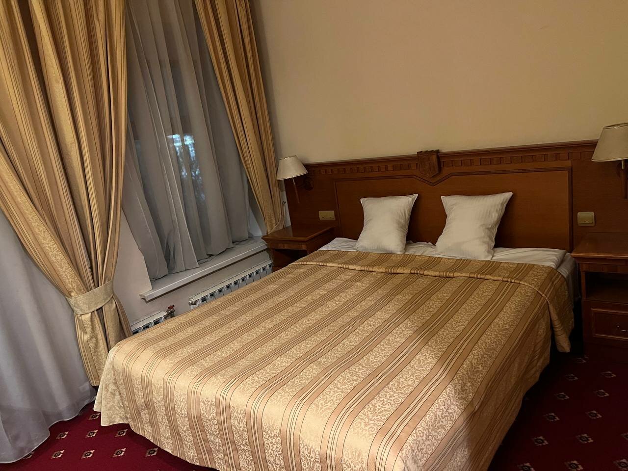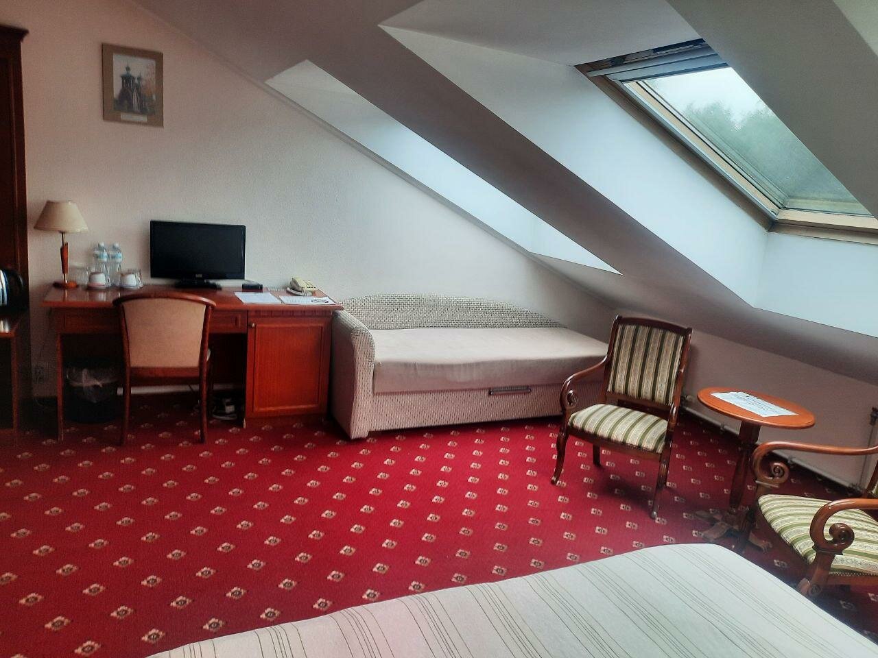 Не работает телевизор ( минуту поработает, потом пишет, что плохой сигнал). Гостиница старая, номера уже не такие, как на фото… Пятна на полу, на стенах, всё уже пошарпанное, пыль, единственный плюс — это очень хорошее местоположение отеля и наличие парковки