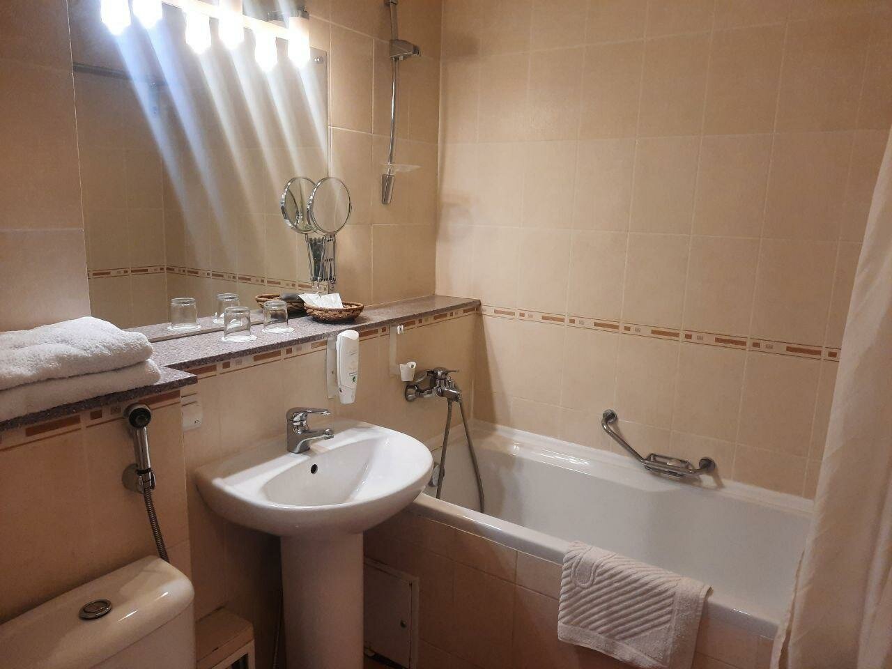В принципе,отель очень приятный,расположение очень удобное. Девушки на ресепшене очень приветливые.Завтрак-шведский стол,сытный.Жили в мансардном номере с видом на проезжаю часть,слегка уставший,электрикам не мешало бы подремонтировать розетки.В остальном,твердая четверка.