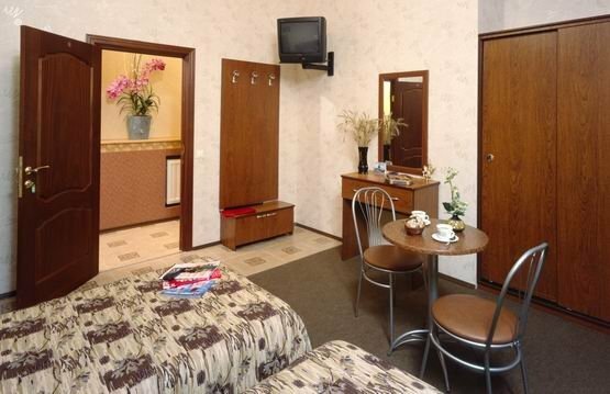 В номере двуспальная и односпальная кровати, кресло-кровать, прикроватные тумбочки, шкаф, журнальный столик. Из удобств: ЖК-телевизор, холодильник, кондиционер, фен. В номерах на первом этаже. Санузел совмещенный в номере.
