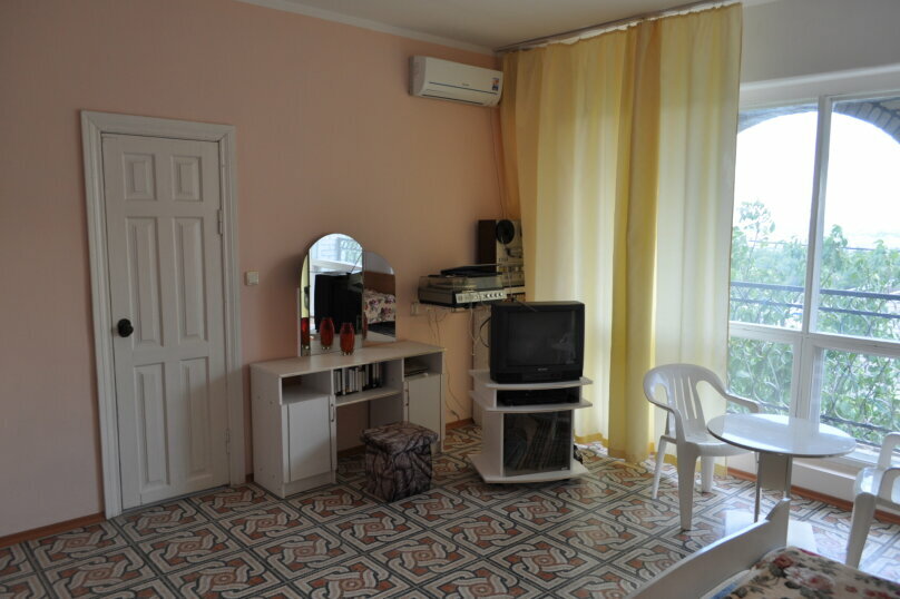 Вместимость до 4 мест35 кв. м 1 комн.Спальных мест: 2+2Балкон, вид на море.Комнат в номере: студия с кухонной зоной.Ванная комната: Душевая кабинаВнешняя территория и вид из окон: Балкон Вид на мореМебель: Обеденный стол,Диван,Стулья Шкаф