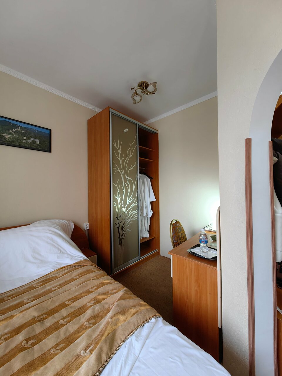 Здравствуйте! Одну звезду персоналу — очень отзывчивые и добрые люди ! Спасибо! Еще одну за бассейн — приятно было поплавать, отдохнуть с дороги. На этом все — плюсы закончились. Бронировал Люксесли это Люкс, то боюсь даже представить что такое не Люкс в этом отелеи да, если Вас трое и необходимо третье спальное место, то то что называют диван-кроватью, по факту ужасная раскладушка на которой спать не возможно!! Пришлось со взрослым сыном спать на одной кроватихорошо что бронировали на одну ночь. Не рекомендую точно. Ах да, Люкс стоил 5500р. За ночь!