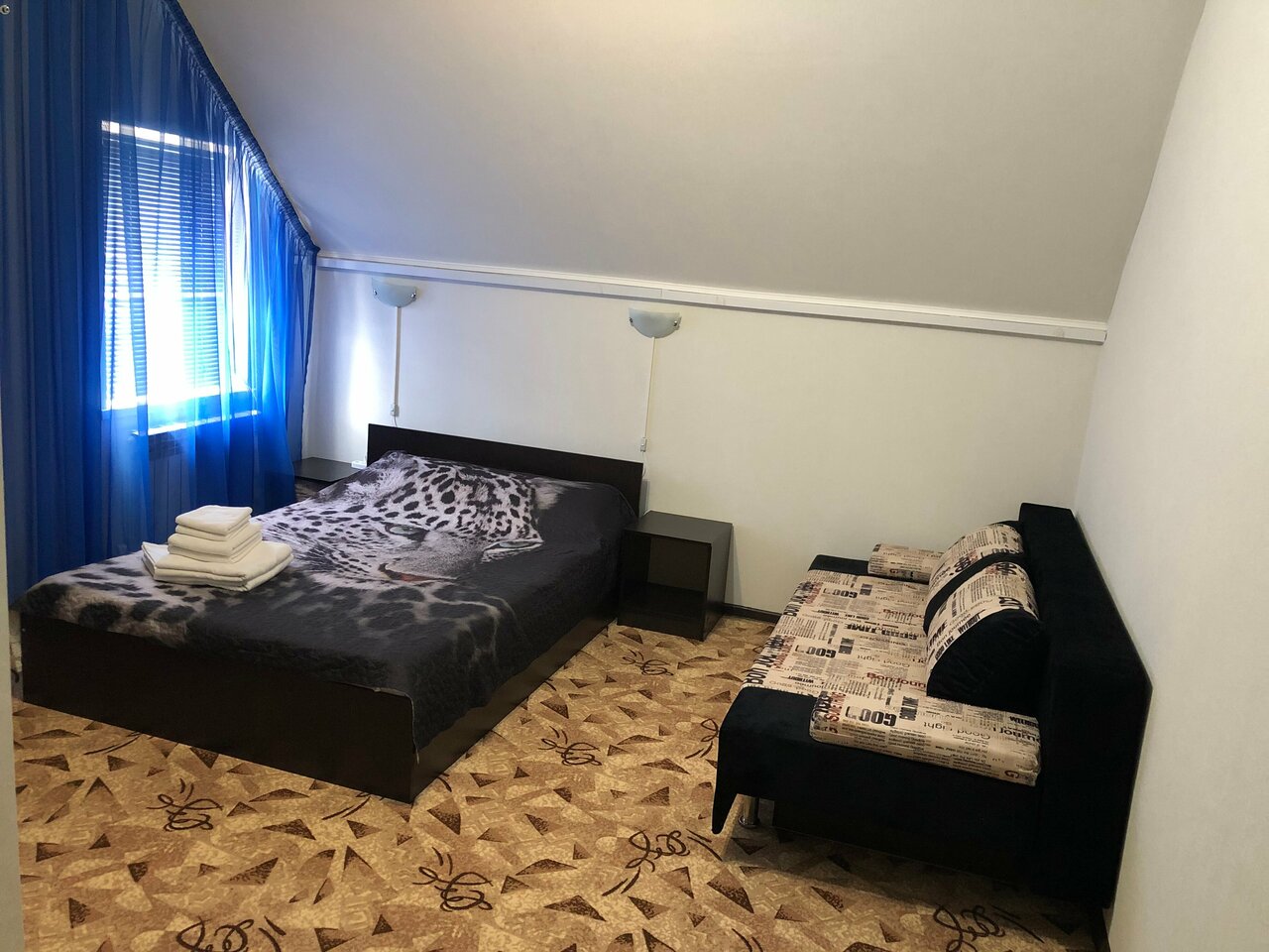 Просторный номер с гостиной и спальней, максимум для 4-ех гостей. Кровать может быть как двуспальной, так и двумя односпальными, на Ваш выбор. В номере есть санузел с душевой, шкаф для одежды, рабочее место, диван. Полотенца, душевые наборы, халат...