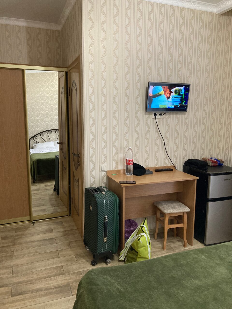 Кондер висит над головой, нет чайника в номере, но есть минихолодильник. Маленький телевизор висит, белье чистое, мыло жидкое есть. 3х местка вышла 3,5тр. Администратор попалась недружелюбная, как будто ее заставляют работать