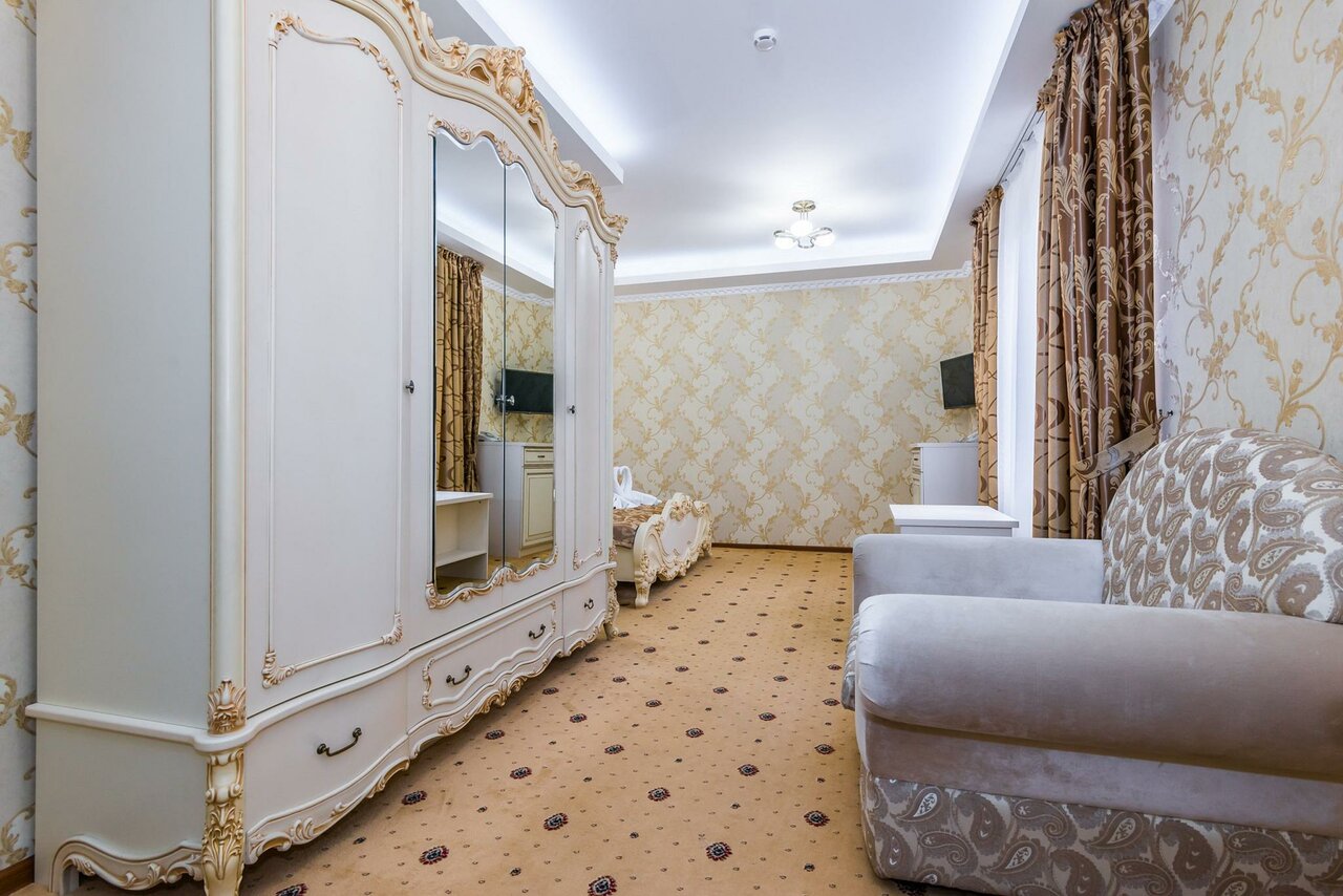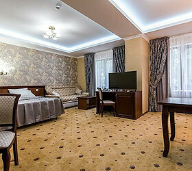Просторный светлый номер с большой кроватью с высоким матрасом и гостинным уголком. Площадь номера 35 кв.м. отлично подойдет для размещения 2 взрослых гостей. Возможно размещение 1 дополнительного места. Покрытие пола – ковролин, на стенах – обои. Но