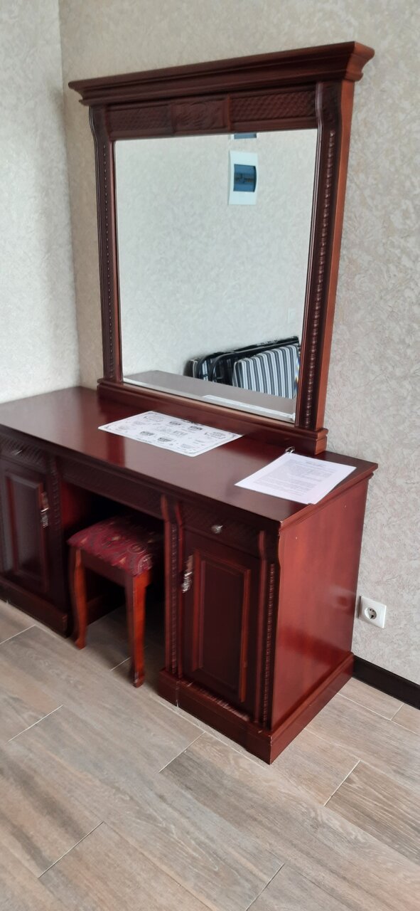 Просторный, двухкомнатный номер с кондиционером и двумя санузлами. В номере три двуспальные кровати, холодильник. Шкаф, обеденный стол, тапочки для каждого гостя, средства личной гигиены. Номер расположен на третьем этаже.
