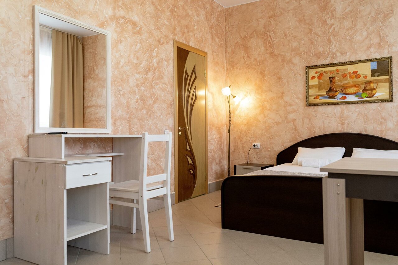 Отличная гостиница. Выбрала номер стандарт улучшенный. Чисто, уютно. ТВ вообще — есть wink, vk video и тд. Есть кондиционер. На этаже есть кухня, микроволновка, чай, кофе — можно пользоваться. В номере есть зубной набор, жидкое мыло, шампунь (геля для душа нет), тапочки. Есть гладильная — доска шатается и утюг еле работает — пора задуматься о замене. Завтраки скромные, соответствуют уровню гостиницы.