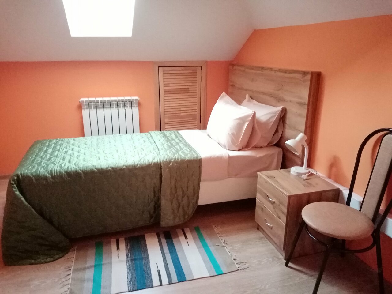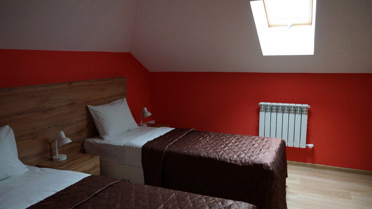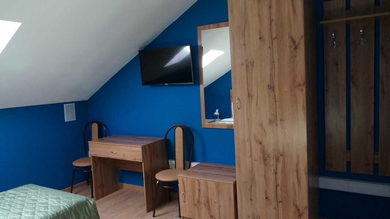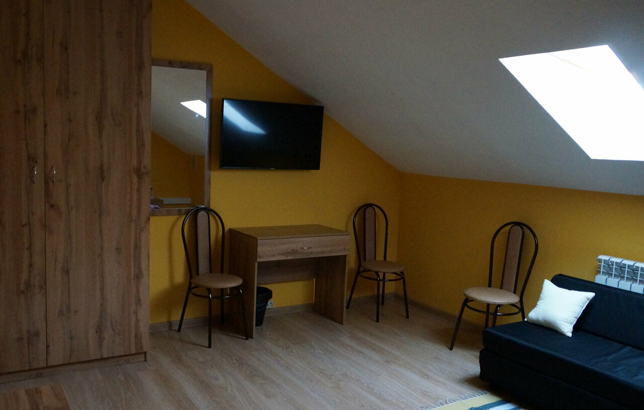 В номере: односпальная кровать, тумбочка, письменный стол, стул, зеркало, телевизор, Wi-fi, вентилятор, мансардное окно с москитной сеткой, полотенца, белье, тапочки. В доме: 3 санузла с душевыми кабинами, кулер, чайник, холодильник, парковка, музей.