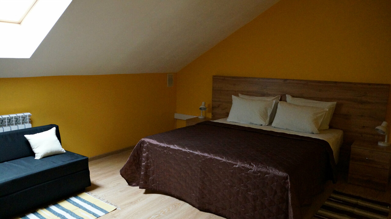 В номере: 1 двухспальная и 1 односпальная кровати или 3 односпальные кровати, тумбочки, стол, стулья, шкаф, зеркало, телевизор, Wi-fi, вентилятор, мансардное окно с москитной сеткой, полотенца, белье, тапочки. В доме: 3 санузла с душевыми кабинами.