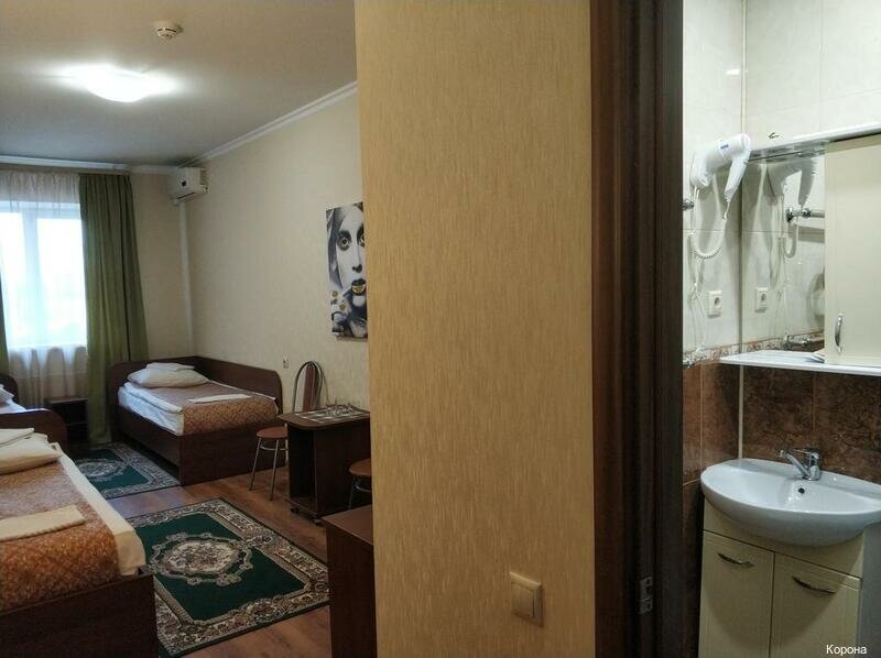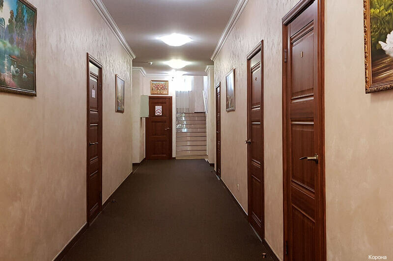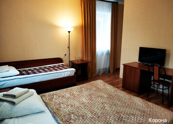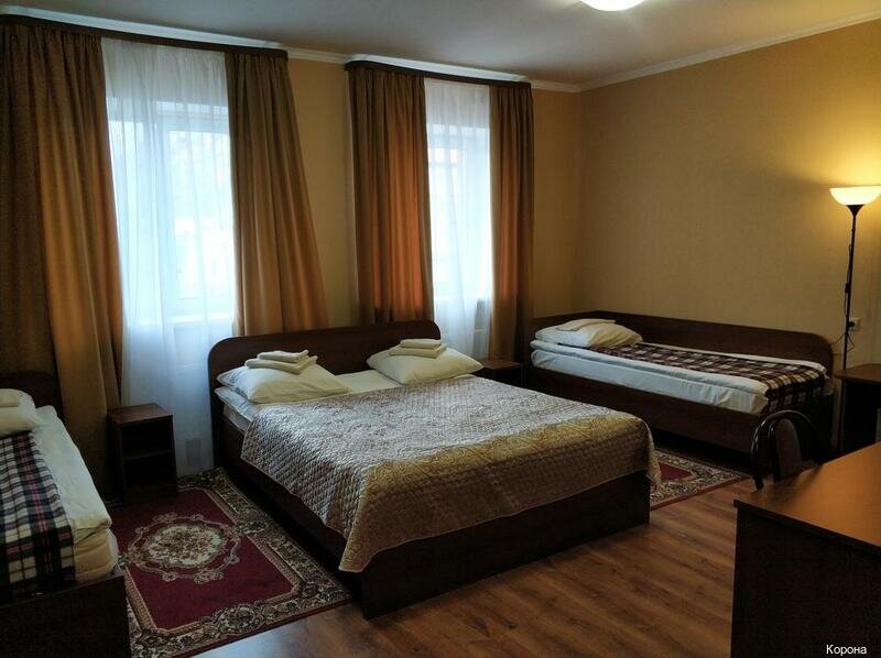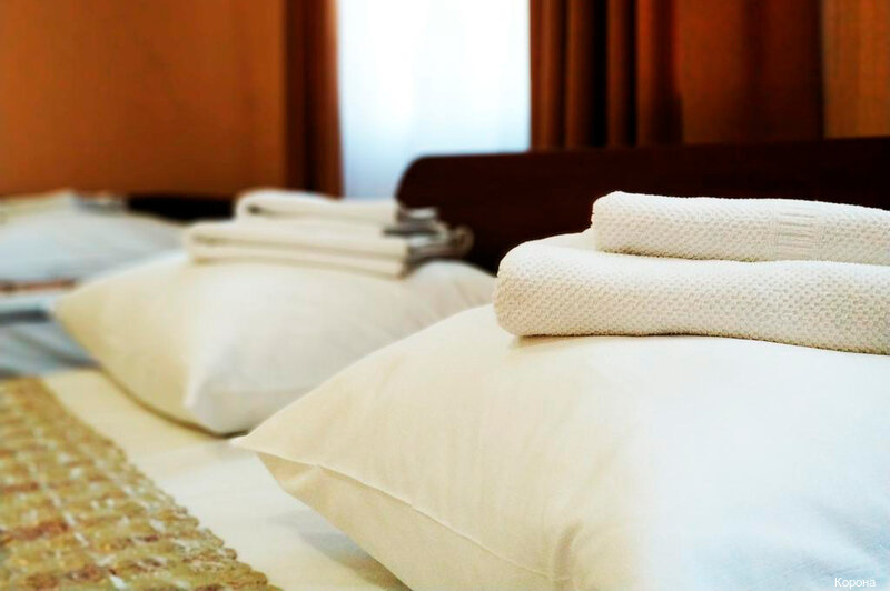 Минусы: 1) Не было кондиционера. 2) ‘Не мешает железная дорога’ — мешает, если окна возле неё. 3) Нет мыла. 4) Туалетной бумаги практически нет. 5) Пыльный номер, старая мебель. 6) Отель не огорожен со всех сторон. 7) Рядом находится ресторан, в соседнем здании, также называется как и отель (‘Корона’),видимо относится к отелю (на карте не видно): пицца — замороженный продукт; основа, которую покупают в магазинах для готовки дома. И это за 650 руб. (Фото прилагается) Из плюсов: 1) Компетентный администратор. 2) Красивые картины.