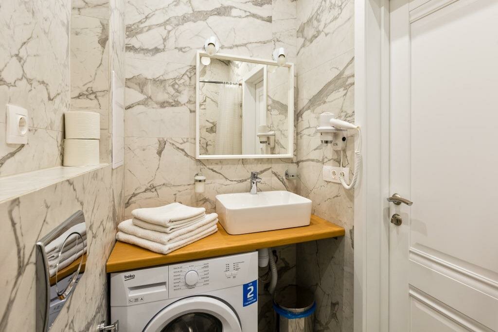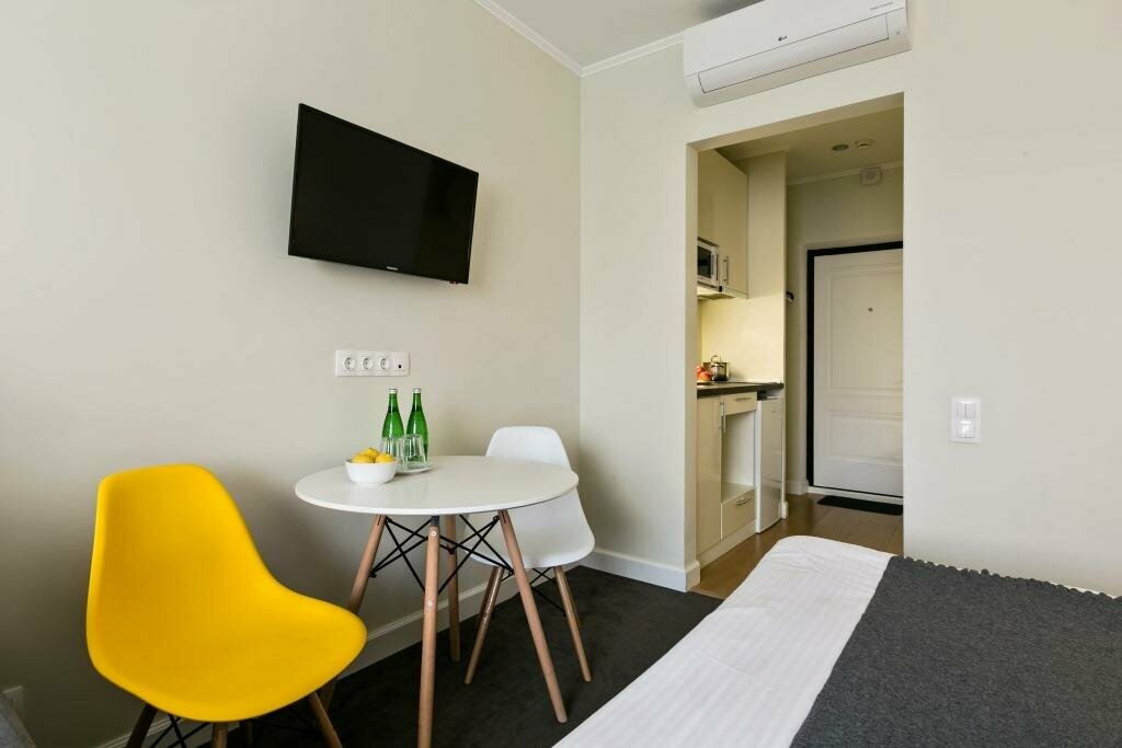 Апартаменты в реальности отличаются от фото. В ванной и умывальнике затруднен сток воды. По тв менее 10 каналов, горничная не убирает, единственное окно грязное, а подоконник весь в птичьем помете. Не плохой вариант, жить можно, но дороговат исходя из реальных условий.