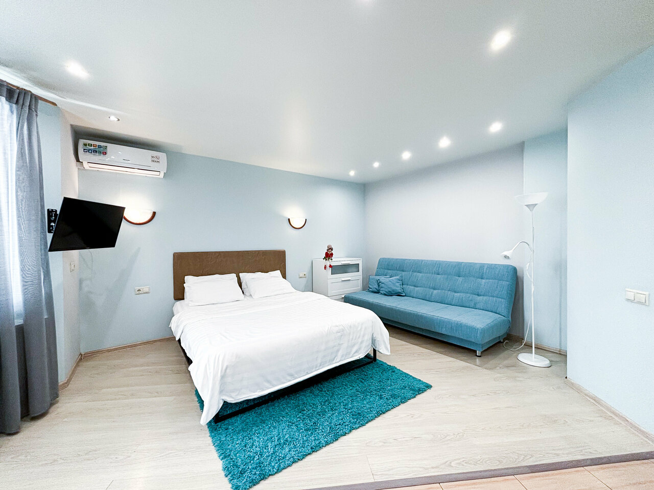 Предлагаем студию для аренды посуточноВ этой студии вас ждет уютная двухспальная кровать, диван, кухня с техникой, балкон, душ и туалет