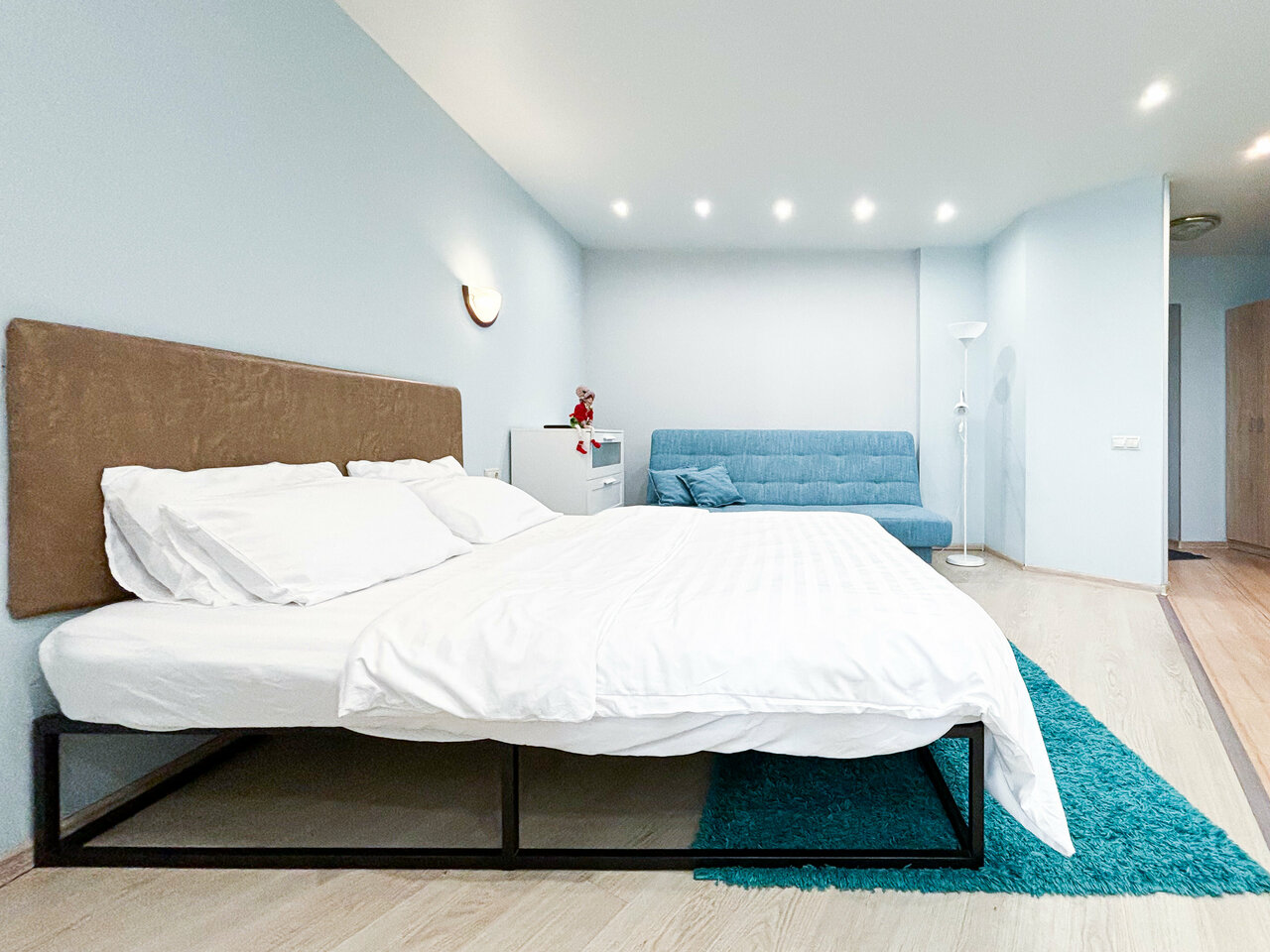Уютная студия с широким набором удобств.Возможность приготовить себе домашнюю еду, так как кухня оборудована всем необходимым оборудованием.Двуспальная кровать и диван