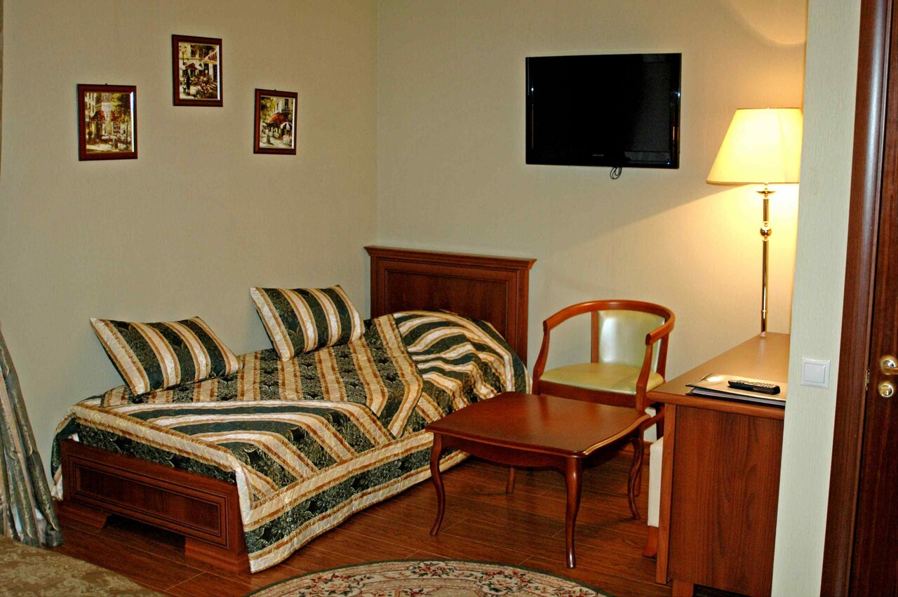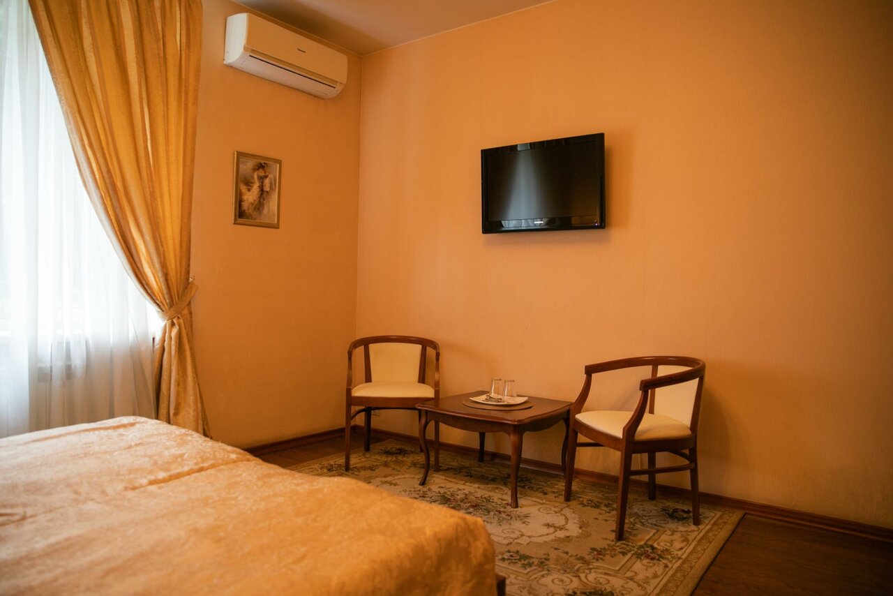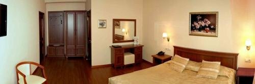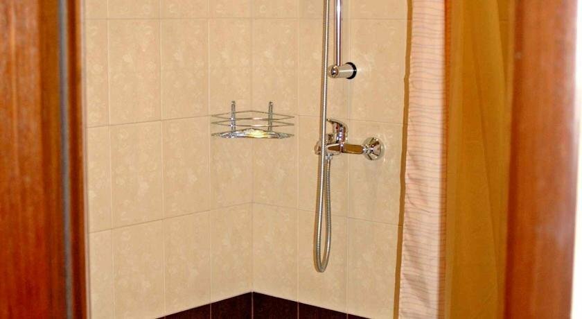 Номер на первом этаже, среднепросторен, с обычным санузлом. В номере был минихолодильник (кустарно встроен в шкаф, но рабочий), старый ж/к телевизор (с не родным пультом, потому не все функции работали). Порадовало наличие кофейного столика и двух кресел. Не обрадовала отвратительная звукоизоляция, когда в ответ на мой просмотр ролика с мобильного телефона в дверь постучал сосед, и попросил убавить телевизор (был вообще выключен!). К спальному месту и белью претензий нет, доисторических насекомых не выявлено. Скорее, могу порекомендовать тем, кто не планирует шумных посиделок.