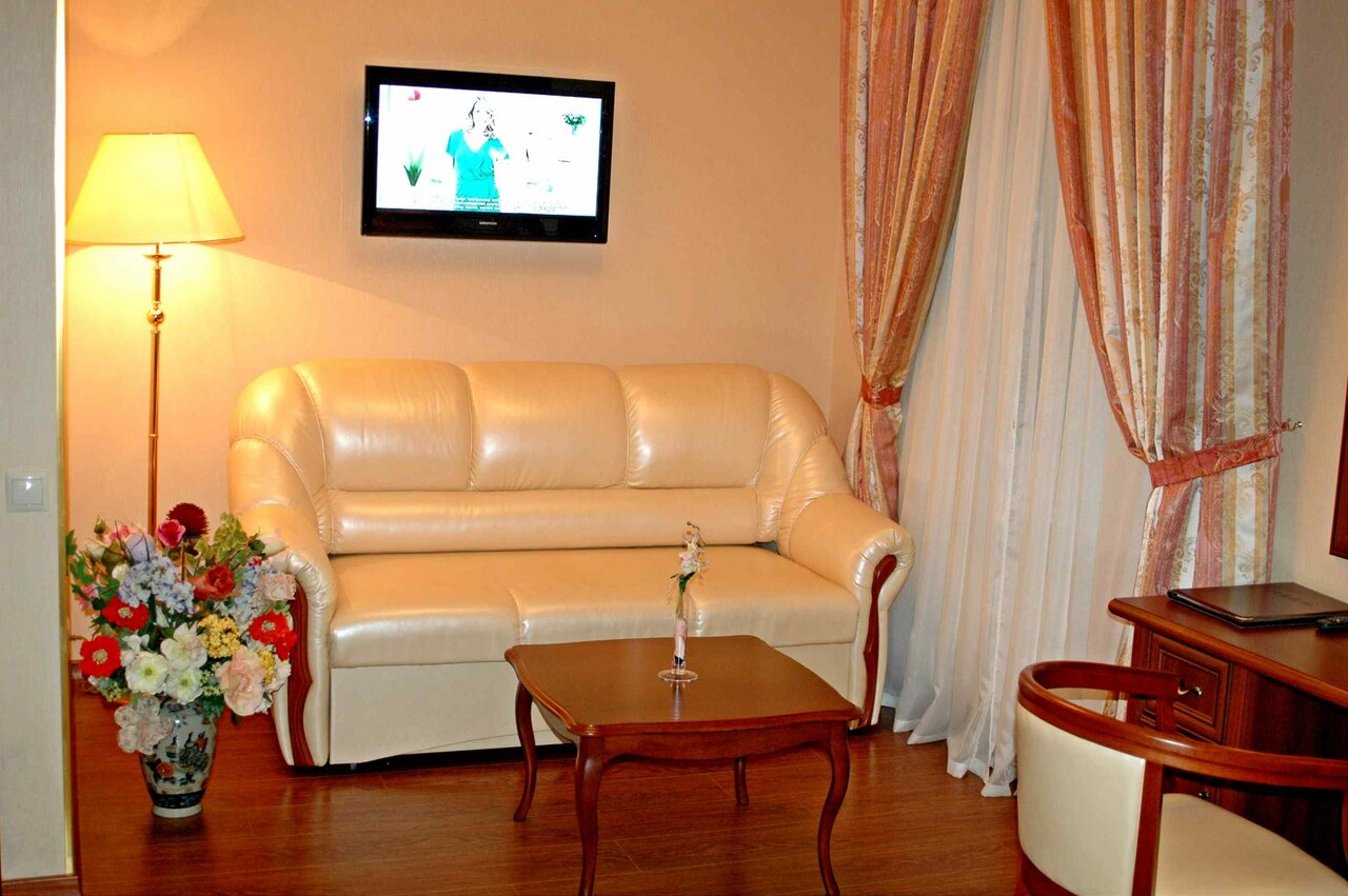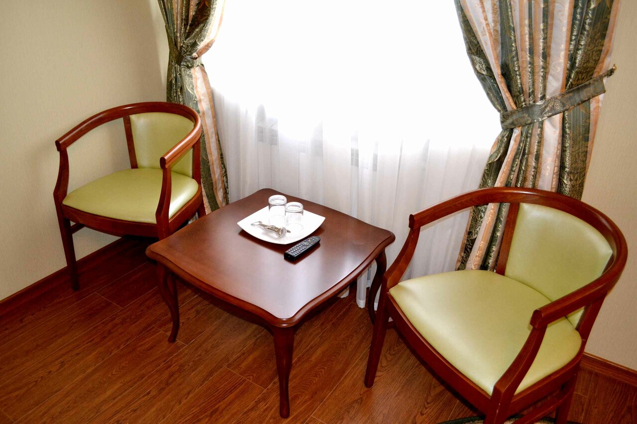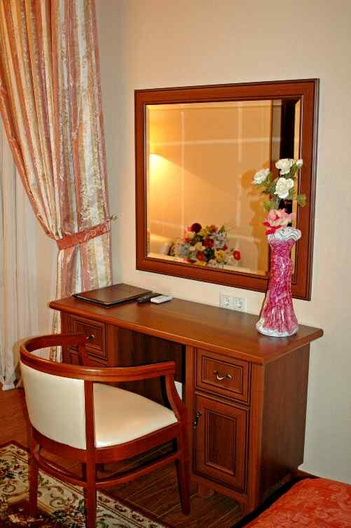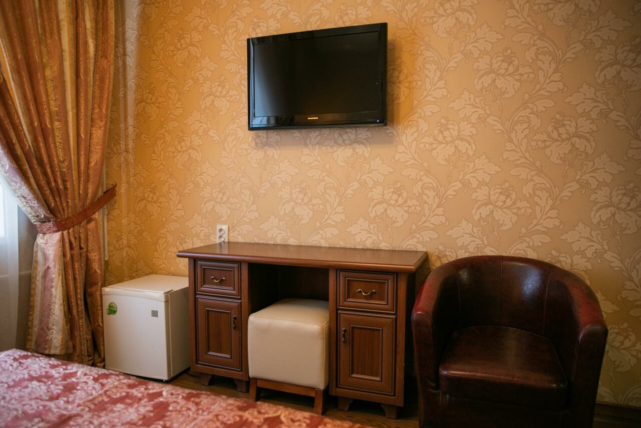 Номер на первом этаже, среднепросторен, с обычным санузлом. В номере был минихолодильник (кустарно встроен в шкаф, но рабочий), старый ж/к телевизор (с не родным пультом, потому не все функции работали). Порадовало наличие кофейного столика и двух кресел. Не обрадовала отвратительная звукоизоляция, когда в ответ на мой просмотр ролика с мобильного телефона в дверь постучал сосед, и попросил убавить телевизор (был вообще выключен!). К спальному месту и белью претензий нет, доисторических насекомых не выявлено. Скорее, могу порекомендовать тем, кто не планирует шумных посиделок.