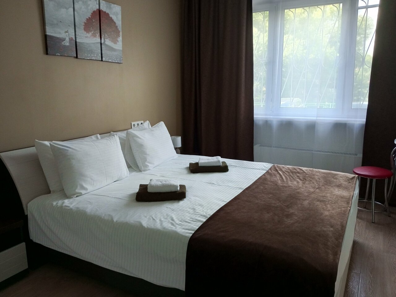 Большая часть каналов по телевизору лагают, двери настолько хлипкие, что слышен любой шёпот, полка для шампуней ржавая, розетка установлена так, что чайник при кипячении нельзя поставить на стол, замок в туалетную и ванную комнату не работает. В остальном на одну ночь людям, которым без надобности зомбоящик, за предоставленную цену зайдёт. Но зачем там стоит телевизор, большую часть каналов которого невозможно смотреть, я не пойму никогда. Возможно, чтобы на фотографиях номер выглядел лушче. И чтобы привлечь любителей телека в комнате. НаНа одну ночь сгодится. Но столько мелких косяков, что нельзя просто взять и поставить больше трёх звёзд