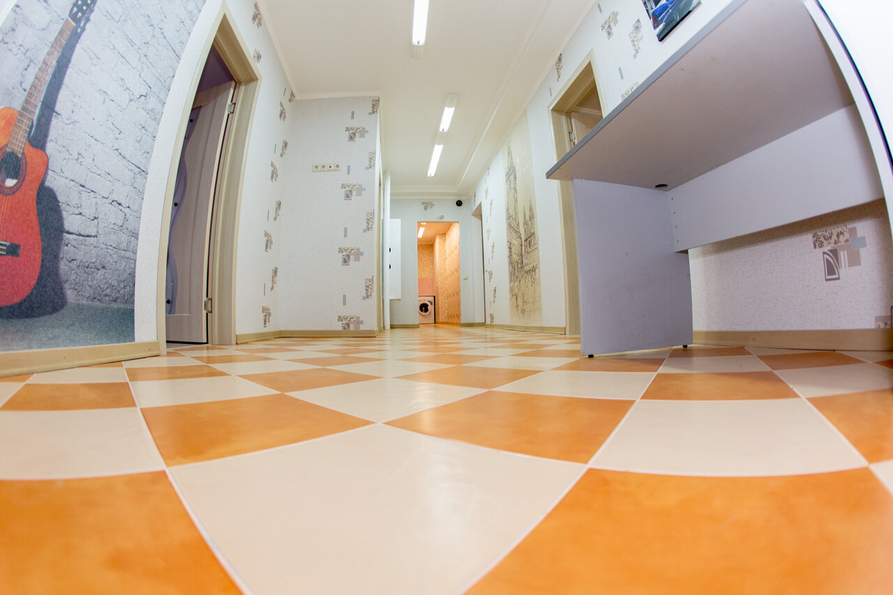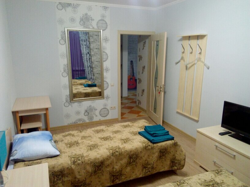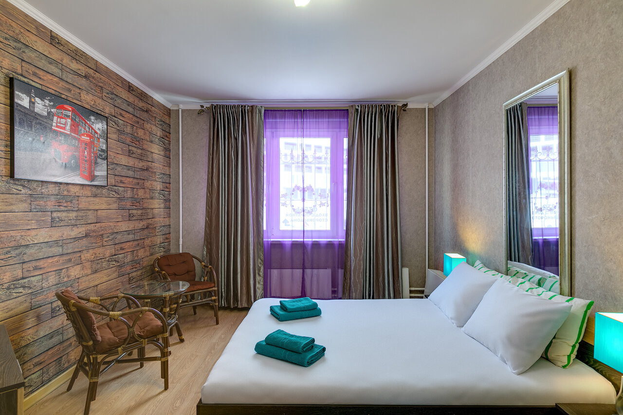 Плюсы: удобное местоположение. Приветливый администратор. В номере чисто, просторно, есть чайник и посуда, также есть кухня и гладильная доска. Минусы: синтетическое постельное бельё, жёсткие полотенца, занавеска для душа была в тёмных пятная от сырости.