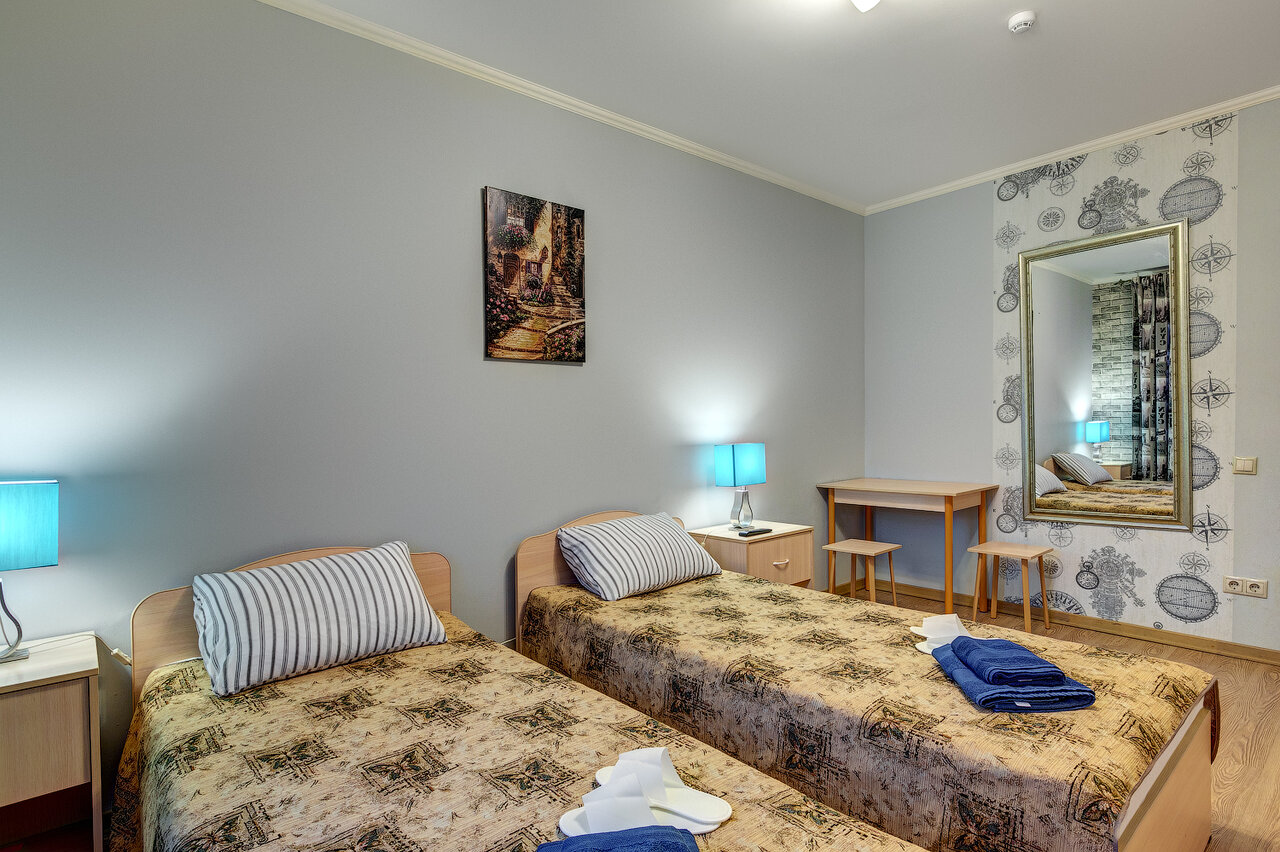 Просторный однокомнатный номер для размещения троих человек. В номере находится одна большая кровать либо две раздельные; односпальный диван; большой телевизор; кондиционер; раскладывающийся диван; вместительный шкаф; туалетный столик. Номер оснащ...
