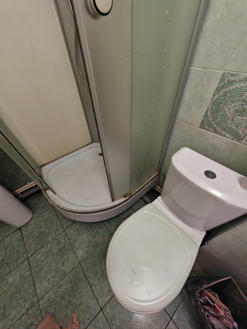 - Старая мебель и ремонт (пожелтевшие детали, разваливающаяся душевая кабина).