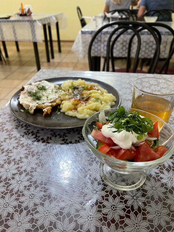 Очень медленно работают официанты. Недопустимо медленно для придорожного кафе. И вид у этих официанток… слово подавальщицы им наверное больше подходит. Бабкам за 60 явно. Еле двигаются. Блюда, обычные для кафешек вдоль трассы. Останавливаться только от безысходности