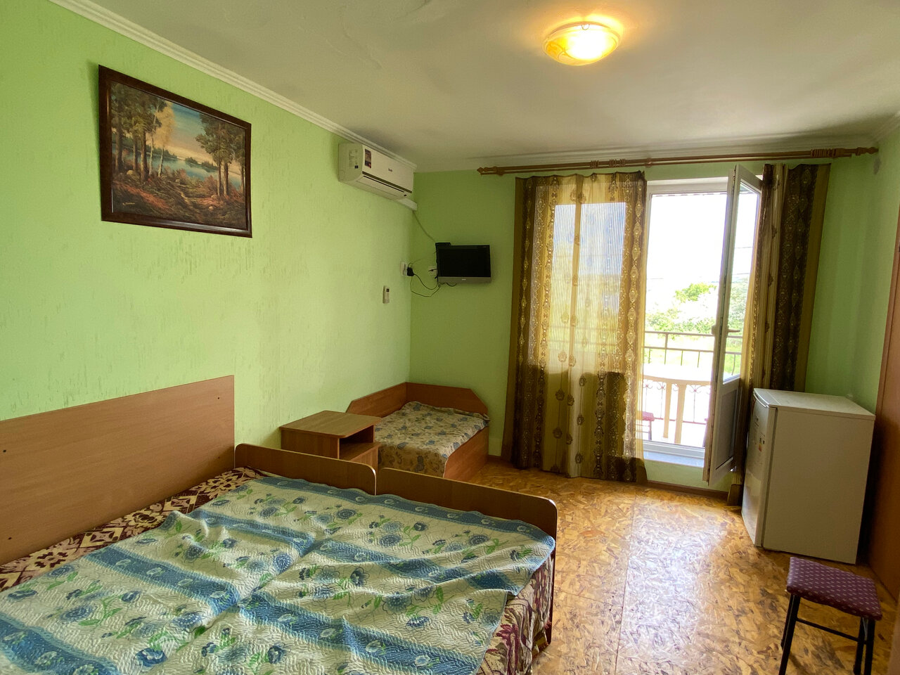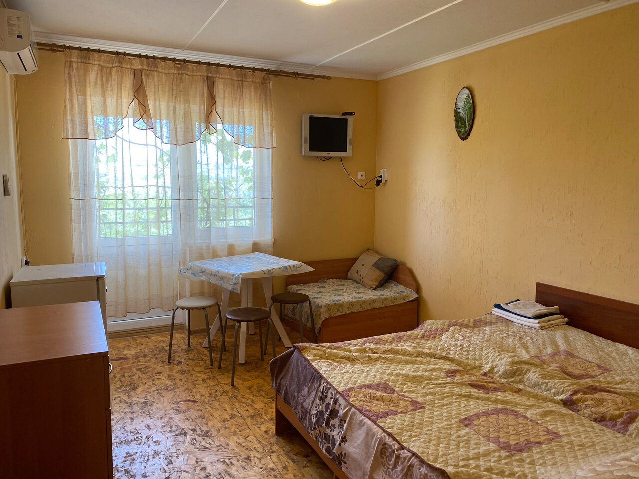 Средне. Неудобные кровати. Уборка на двоечку, постельное старое, затхлое, темно, сыро. Большое помещение, своя кухня и санузел за небольшую плату. До моря только на машине