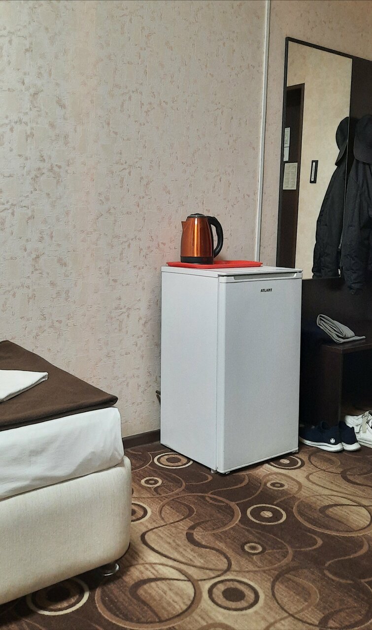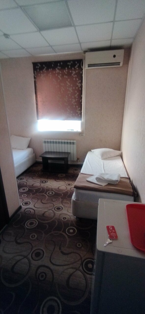 Отличное место. Трёх местный номер включает в себя холодильник, телевизор, кондиционер, душ, санузел в номере, полотенце для рук и тела три комплекта. В номере всё чисто. Хорошая столовая, которая работает круглосуточно. Стоянка для машин. Рядом магазин пятёрочка. Рекомендую данную гостиницу.