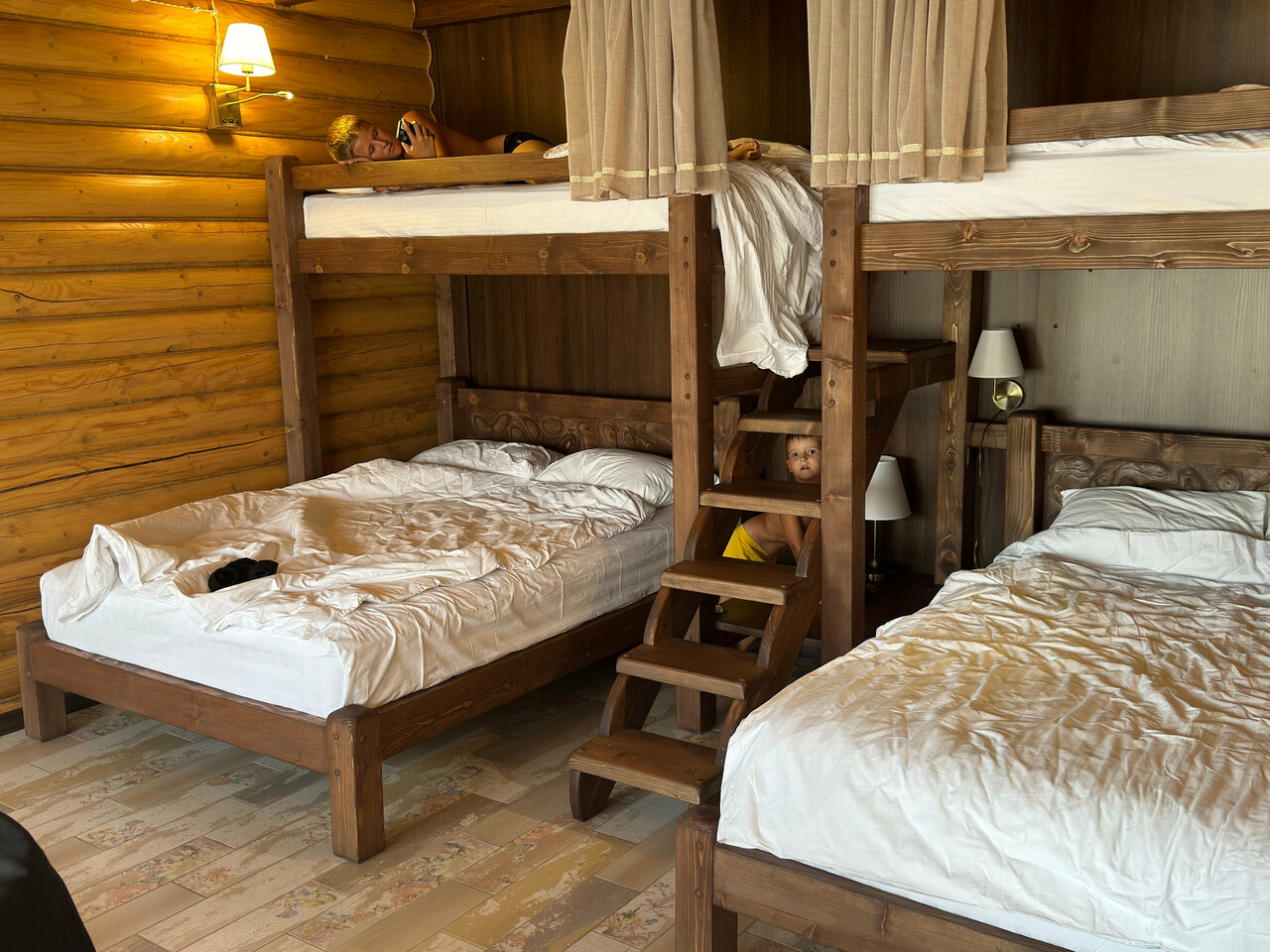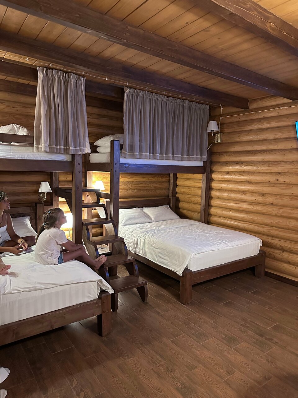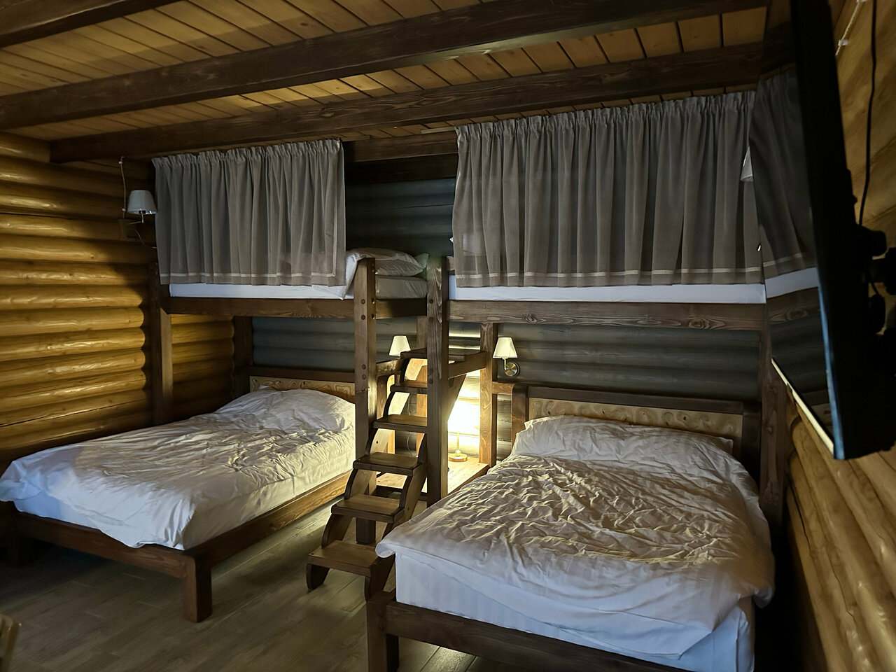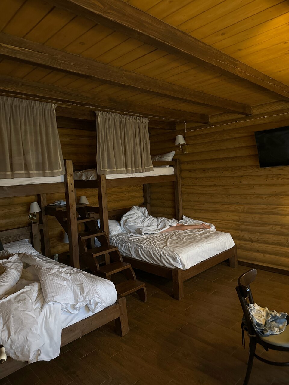 Очень клёвое место. Номер большой. Сказали на 4, но реально 2 двуспальные кровати и 2 односпальные. Все чисто. Еда вкусная, принести прям в номер
