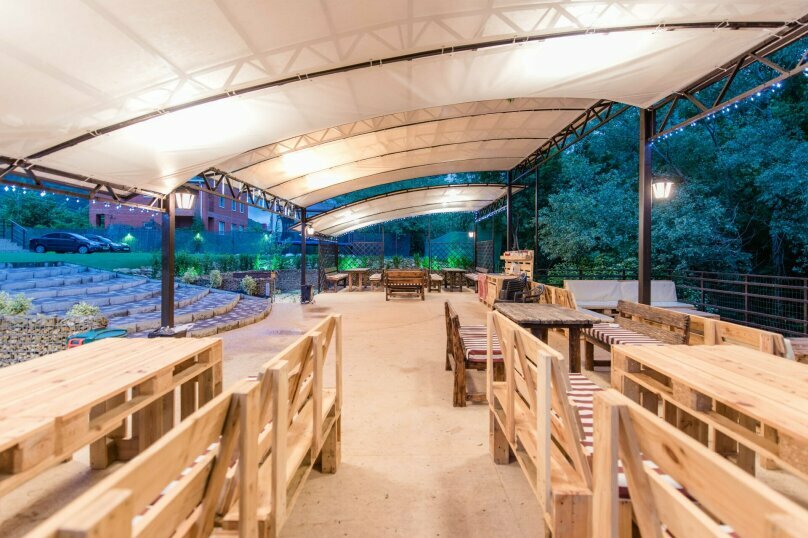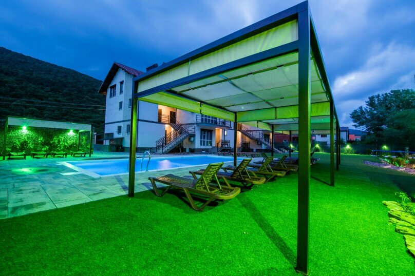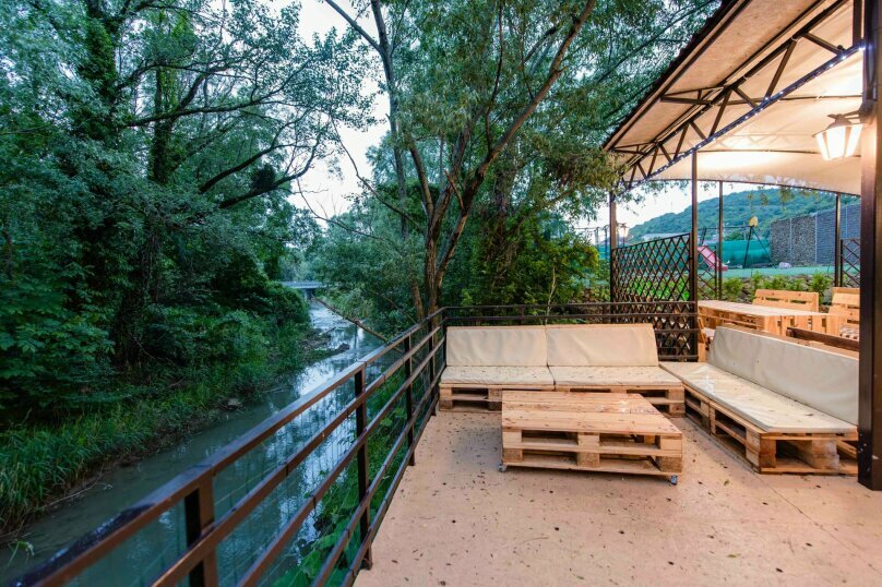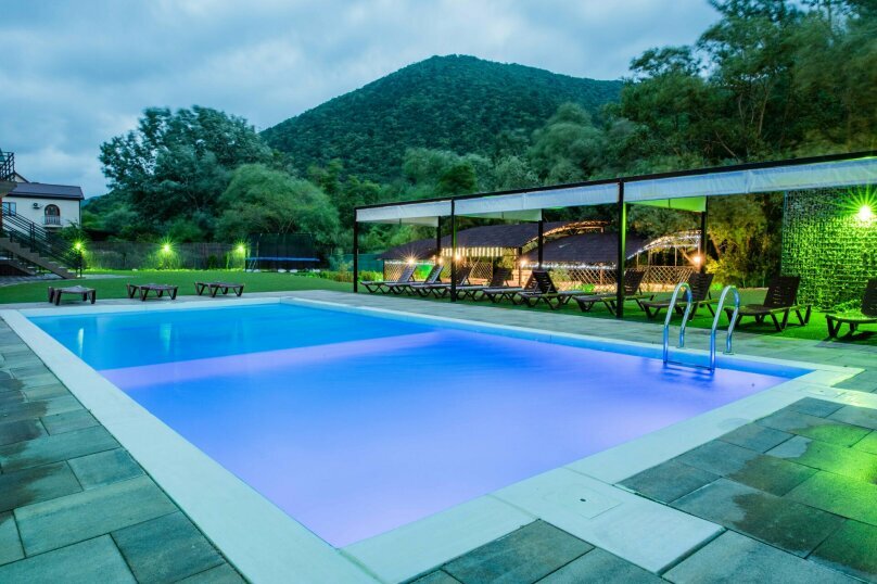 - Два бассейна (включая детский и с подсветкой).; До моря 7–10 минут пешком.; Бесплатный Wi-Fi.; Мангальные зоны, беседки, барбекю у реки.; Детская и спортивная площадки.