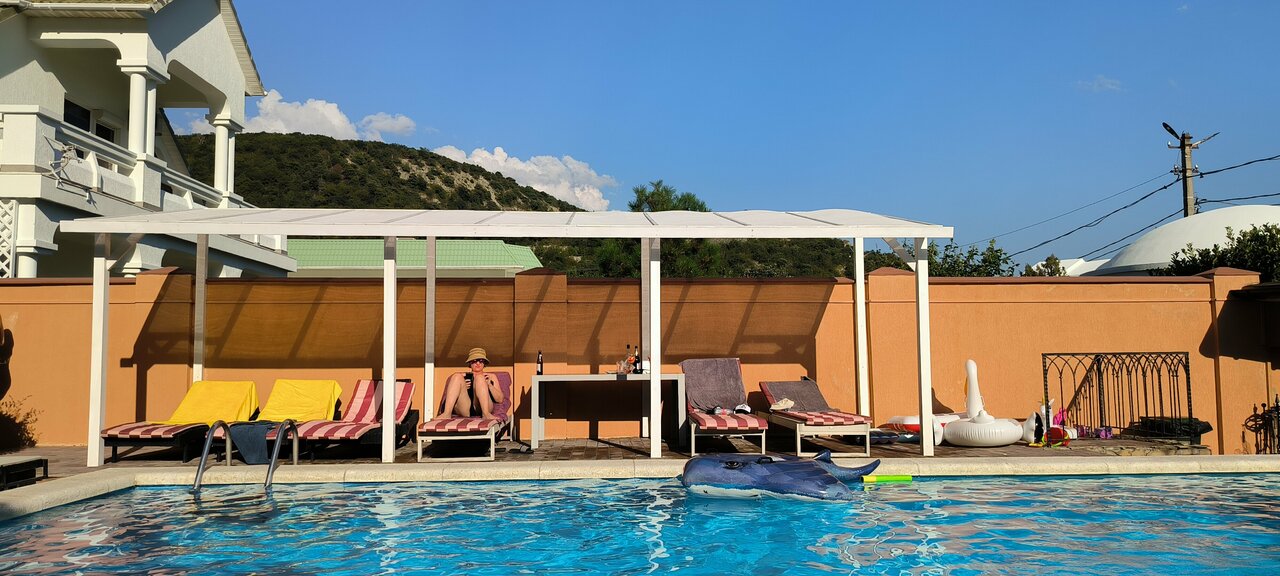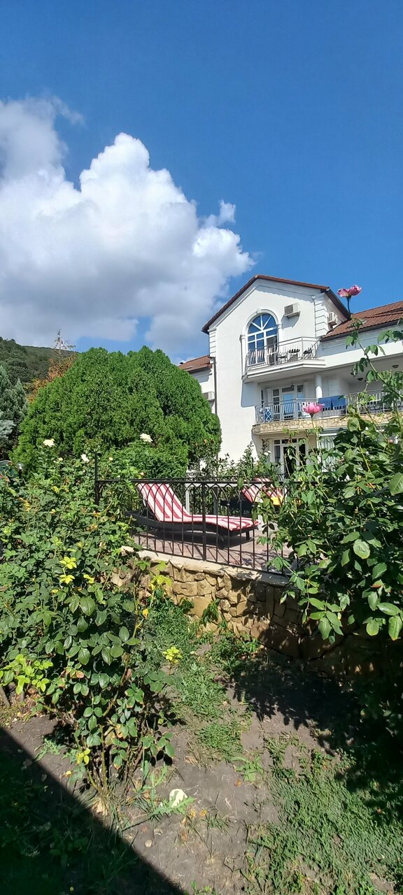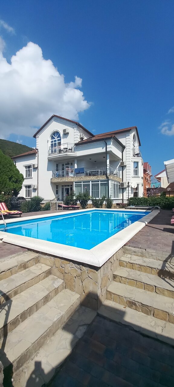 Хороший, небольшой отель, в ста метрах от моря, бронирование было через ВК с пред оплатой, быстро реагируют на сообщения, присылают необходимые фото и отвечают на все вопросы, на территории бассейн с лежаками, на пляже свои лежаки под навесом, которые входили в стоимость(что приятно порадовало) своя вкусная кухня с возможностью ужинать или обедать на террасе, номер убирают ежедневно, но полотенца не меняют, кстати в номере есть полотенца для пляжа. На территории своя небольшая стоянка для авто. На фото 2х комнатный номер люкс. Рекомендую