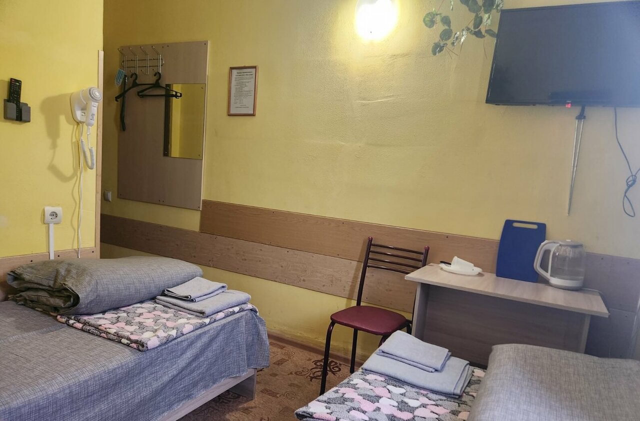 Вежливая администратор, в номере чисто. Дают талоны в столовую. Есть Wi-Fi Недостаток: плохая шумоизоляция номера. В принципе, для ночёвки нормально.