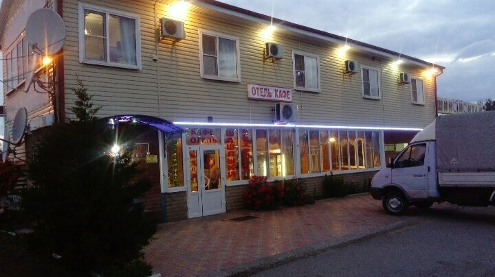 Остановились на ночь по пути с моря. Гостиница расположена непосредственно у развилки — удобно съезжать в обоих направлениях движения. Это была шестая по счету, первые пять, расположенные по ходу движения, были забиты. Четырёхместный номер 2500 за ночь. В номере чисто. Санузел на этаже, но это не страшно — всего восемь номеров. Санузел тоже чистый. Читала, что матрасы жёсткие — это правда. Но мы были на столько уставшие, что не обратили на это особо внимания. В кафе на первом этаже ассорти шоколадок и йогуртов, кофе. Парковка прямо под окнами.