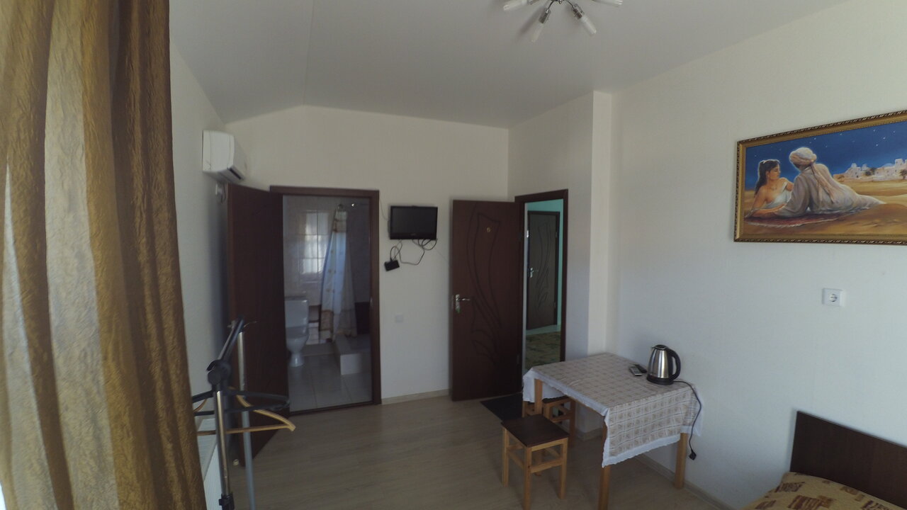 По дороге на море очень долго искала, где остановиться. По отзывам решили выбрать именно это место. Созвонились за два часа с хозяином, сказал, что ждёт нас. По дороге были пробки и мы задерживались, перезвонила предупредила. Машину можно поставить около двора, везде камеры. Хозяин ОЧЕНЬ приятный, гостеприимный, вежливый. Всё как дома. При входе чистый и просторный холл, вход без уличной обуви, при входе можете переобуться в шлепки (всё очень чистое). Номер просторный с высоким потолком, стол, большая, просторная кровать, чистое постельное бельё, телевизор, чайник. В номере душевая комната ( довольно таки большая). Полотенца выдают. На этаже микроволновка, холодильник. Мы только ночь провели и сильно не рассмотрела всё. Но заметила кухню для самостоятельного приготовления пищи, прачку. В следующий раз только сюда.