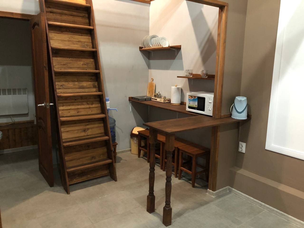 Очень уютный и чистый домик.Все сделано в интересном стиле,действительно ощущаешь себя как будто в деревне у бабушки в гостях.И в то же время очень по-современному и со вкусом.Продумано все до мелочей.Есть комплект подотенец и одноразовые гель для душа,шампунь,зубной набор.Из техники телевизор,холодильник,чайник,микроволновка.Очень кстати есть кулер с питбевой водой.Хозяйка Анастасия очень приветливая,встретила нас около двух чеасов ночи и без проблем заселила.Очень довольны остались.Обязательно заедем еще!
