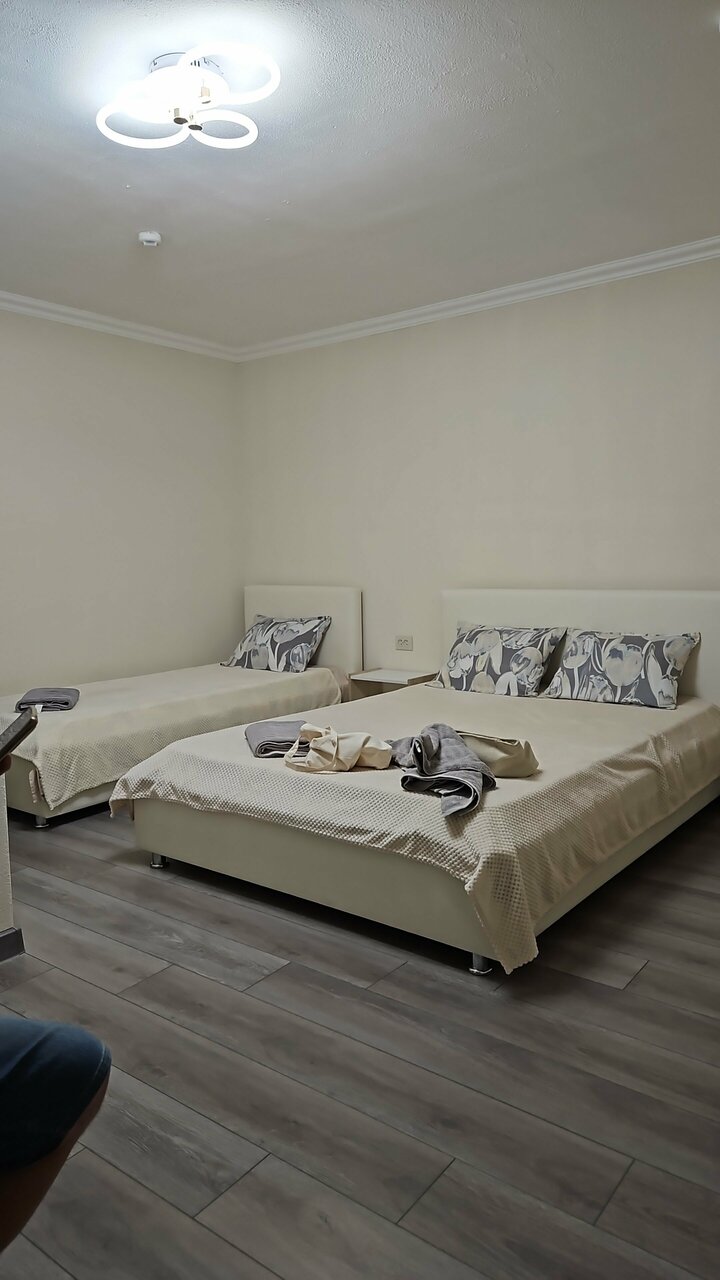Замечательная гостиница, замечательные хозяева. Ремонт отличный, все чисто и аккуратная, все необходимое есть, постельное, полотенца, горячая вода, кофе, сахар, приборы необходимые, кулер, парковканас было 4 взрослых и один ребенок 2,9 предоставили один номер с 2х спальной и односпальной + матрас принесли на пол, заплатили 3500, в дорогу нарвали вкусных яблок, спасибо большое Позвонили ночью где-то в 22:00 и приняли очень быстро. Однозначно рекомендую.