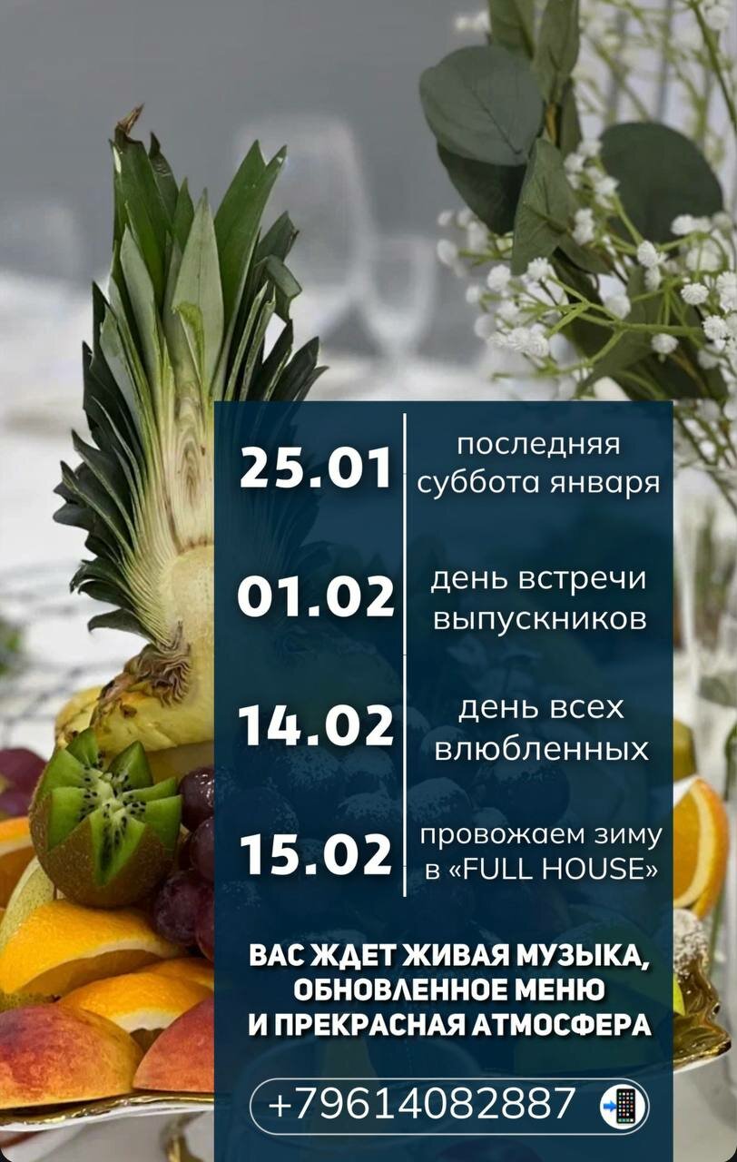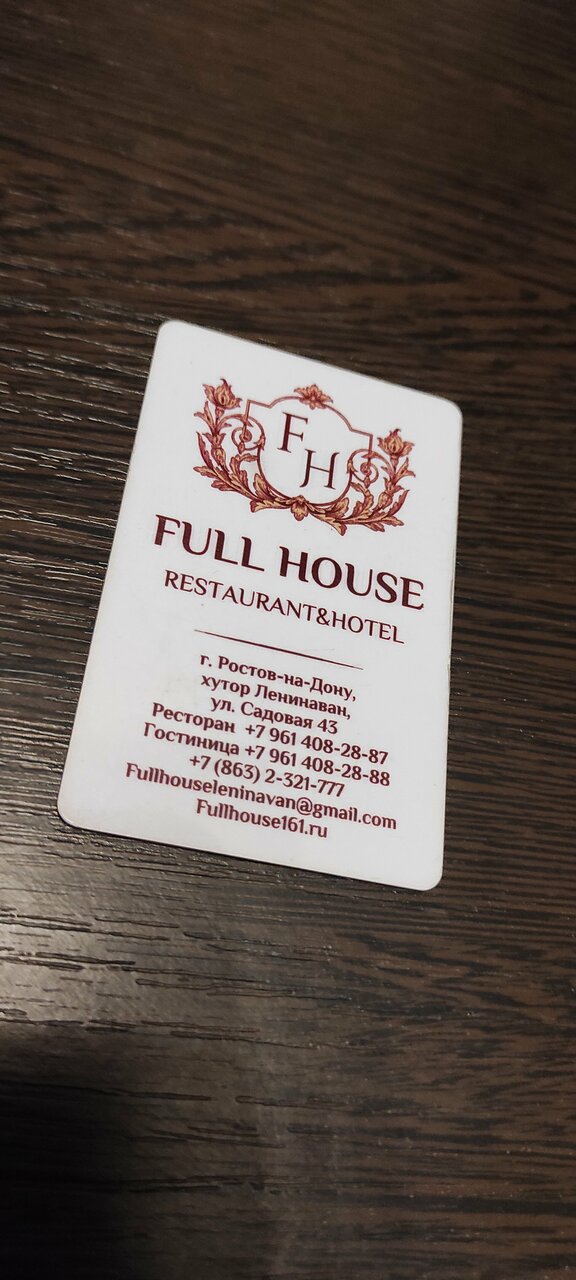 Контакты: — Сайт: http://fullhouse161.ru/ — Телефоны: +7 (863) 232-17-77 (ресепшен), +7 (961) 408-28-88 (ресторан). — Заезд: 14:00, выезд: 12:00.