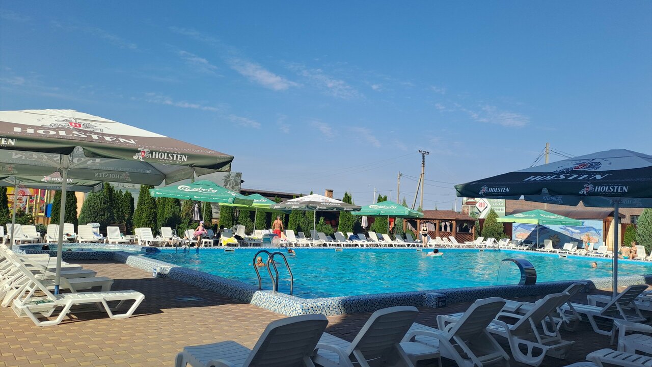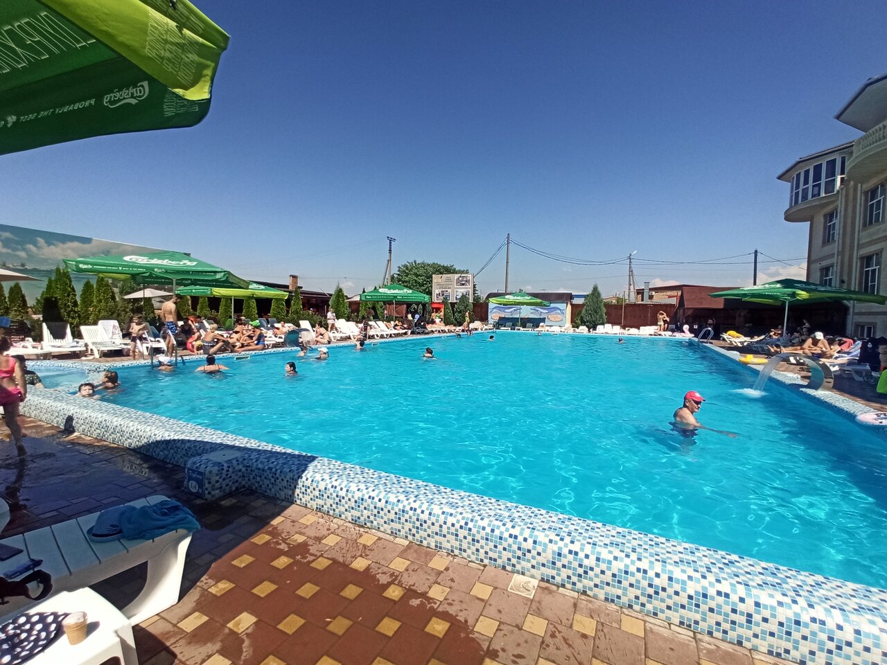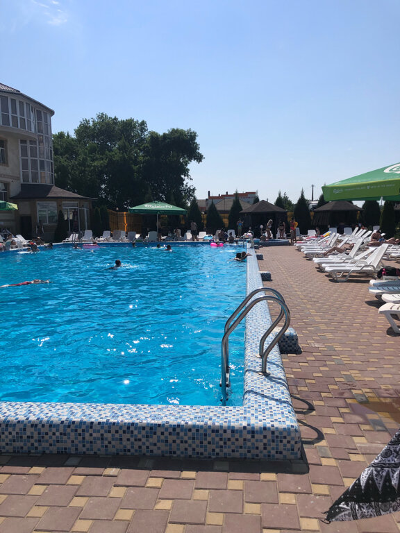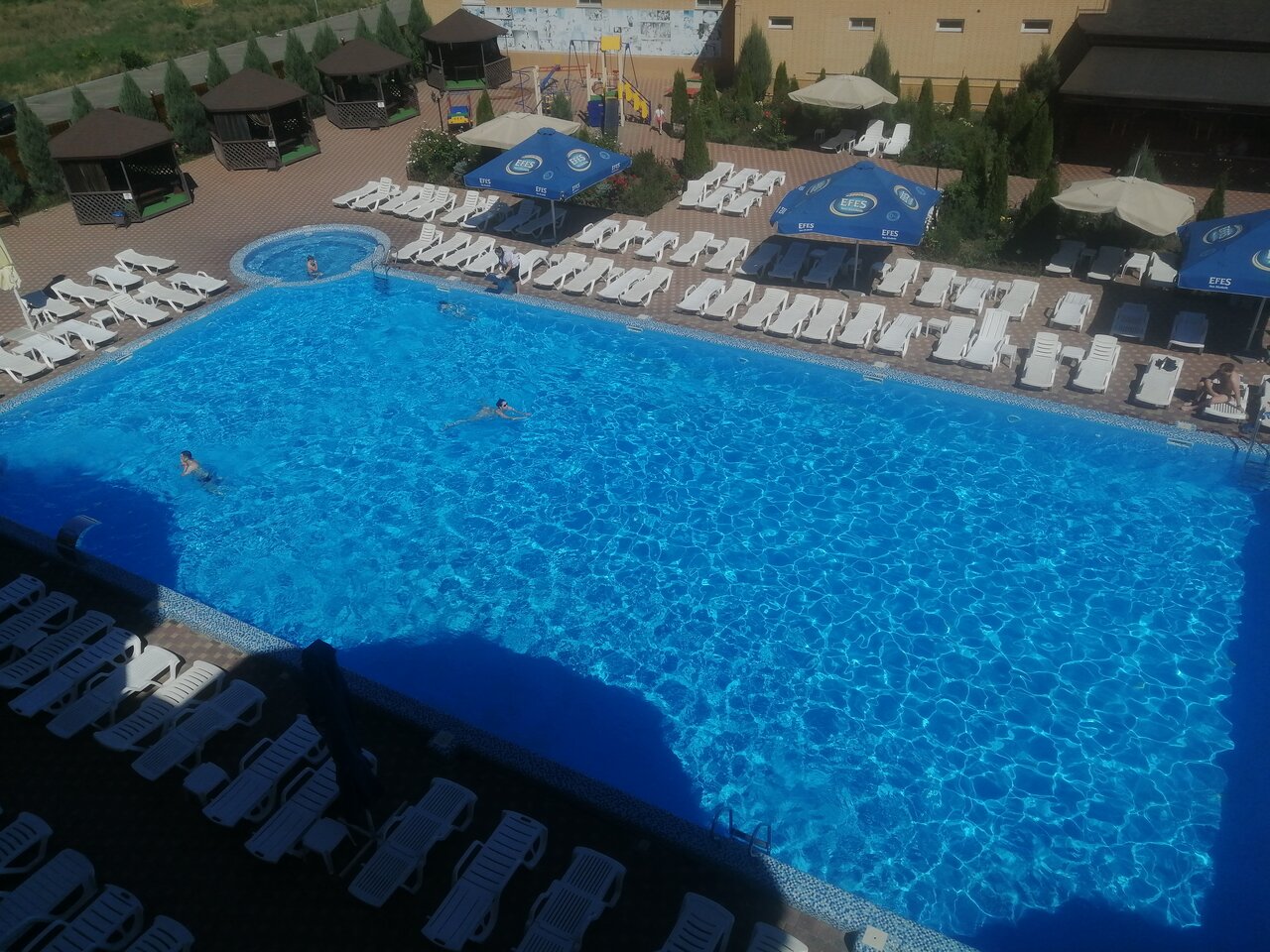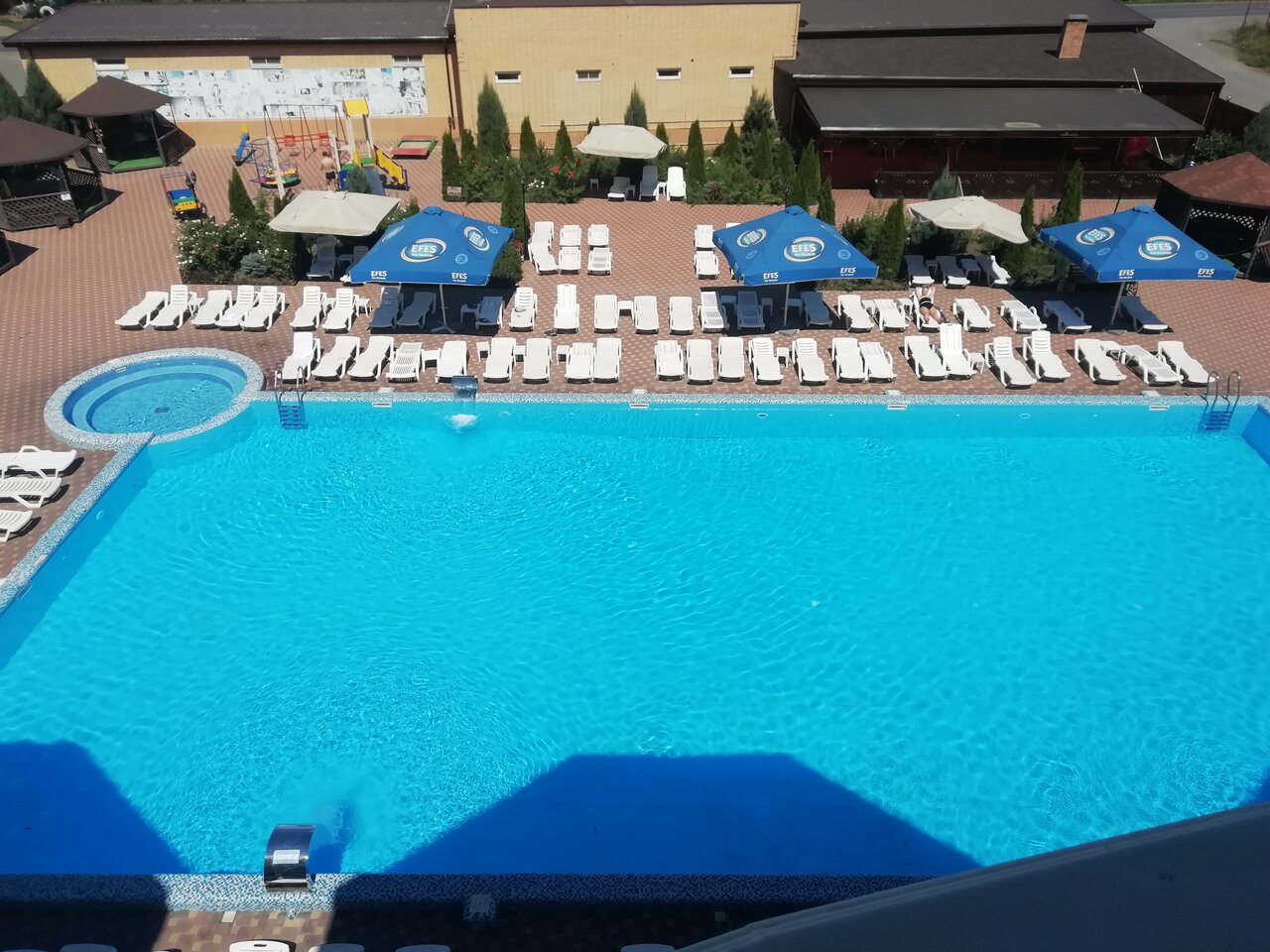 Большой бассейн с разной глубиной, но грязноват. Лежаки расставлены очень близко друг к другу. Кафе нормальное — шашлык, салатики, закуски, пиво. Вечером в будни и в выходные очень много людей. Отель неплохой, в номере чисто. Завтрак такой, что можно считать его нет.