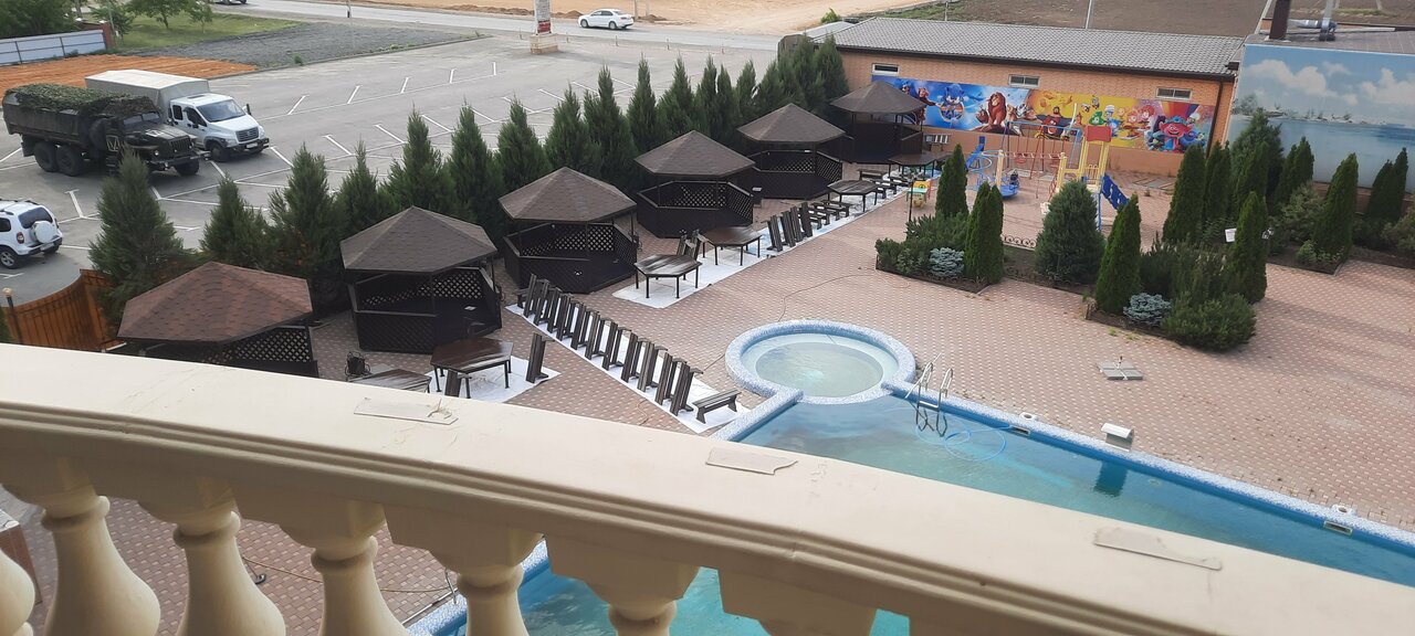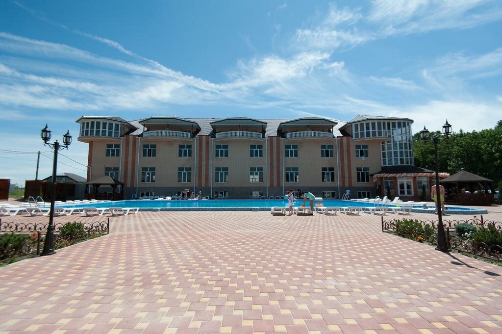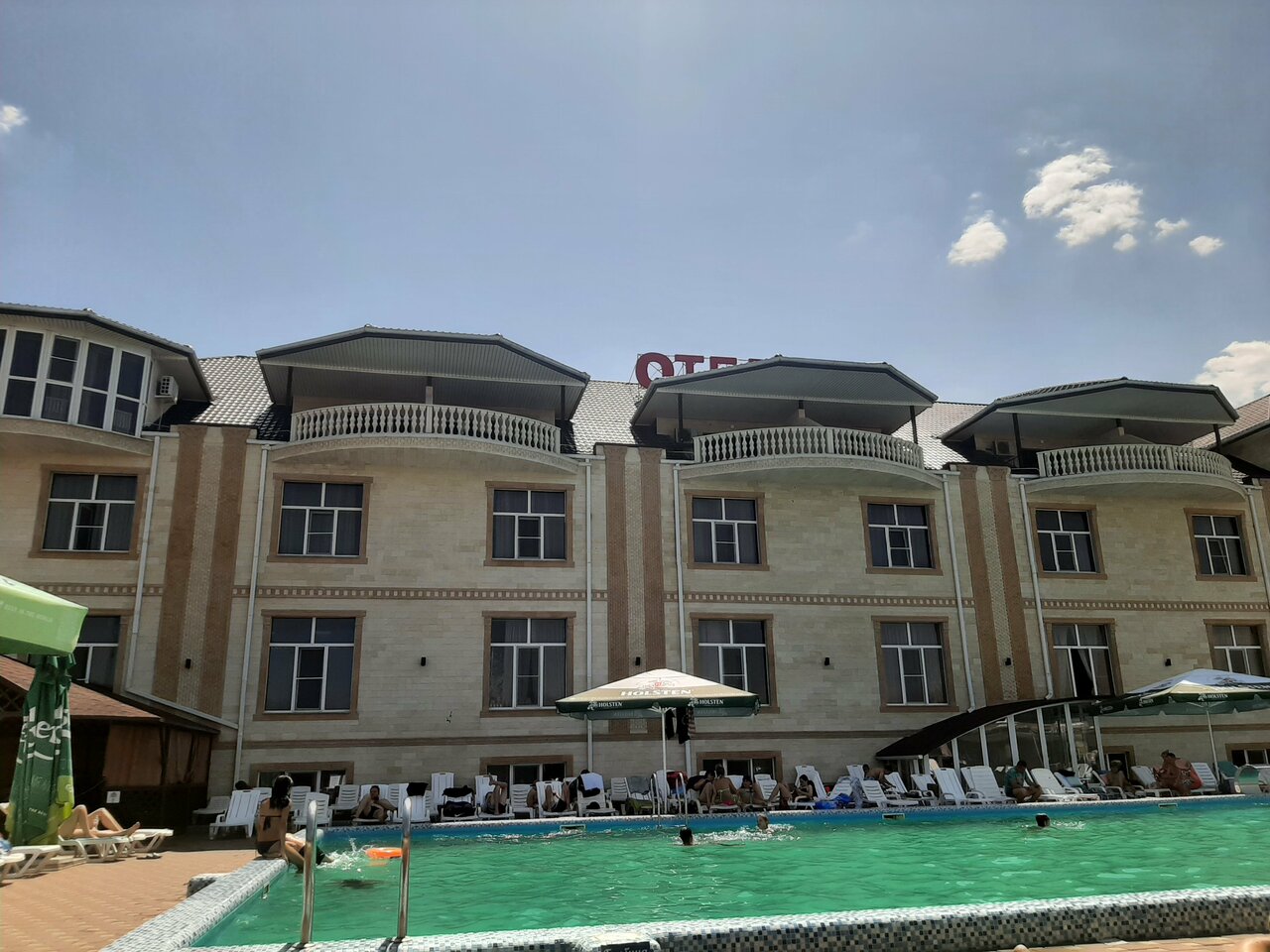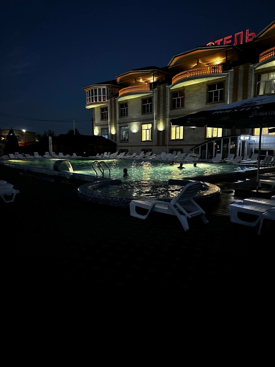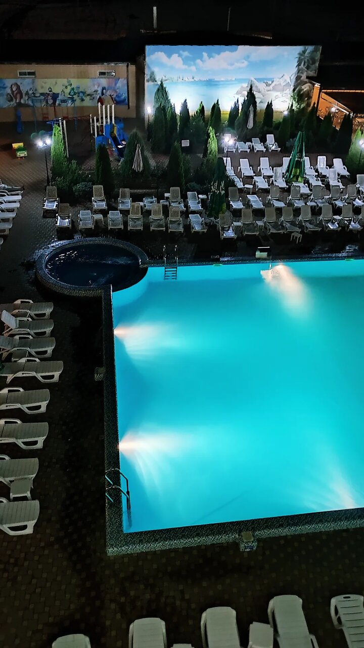 Большой бассейн с разной глубиной, но грязноват. Лежаки расставлены очень близко друг к другу. Кафе нормальное — шашлык, салатики, закуски, пиво. Вечером в будни и в выходные очень много людей. Отель неплохой, в номере чисто. Завтрак такой, что можно считать его нет.