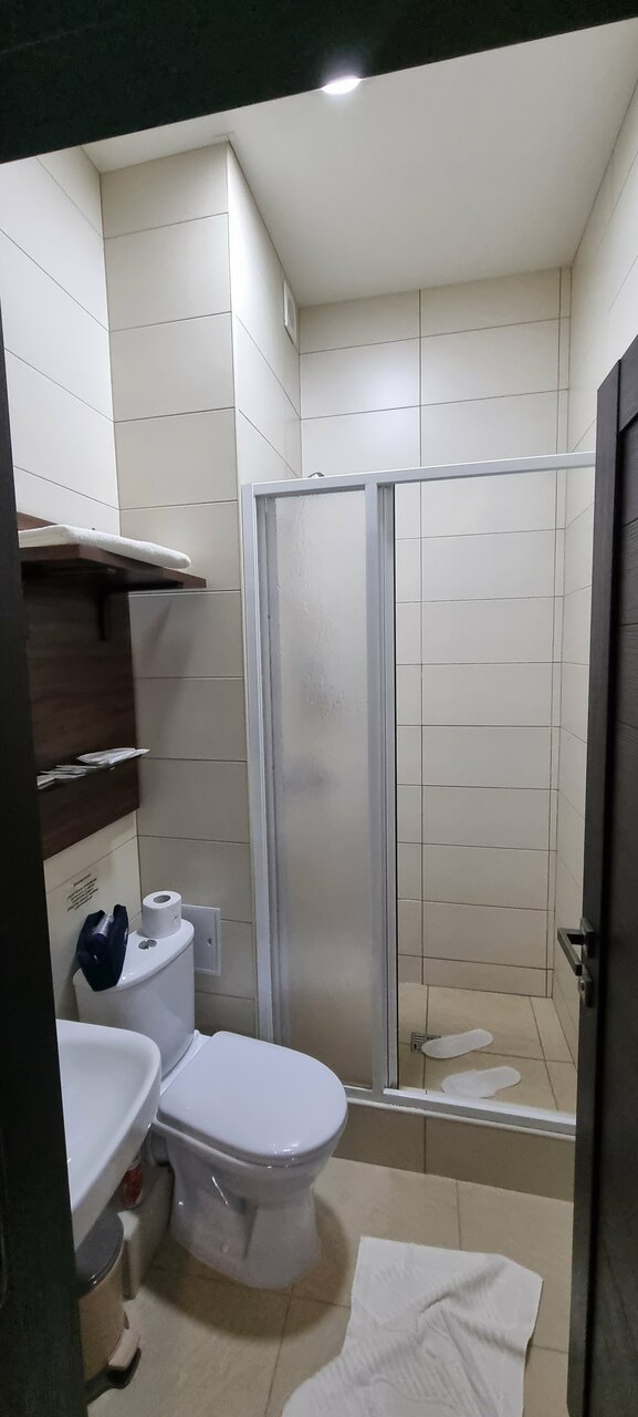 Очень удобное расположение как в сторону моря , так и обратно. Рядом с трассой, но при этом есть где прогуляться с коляской. Плюс, что машин не слышно. Есть кровати для маленьких детей. Выдают одноразовые тапочки и зубные принадлежности…. Есть мини холодильник. Всё чисто